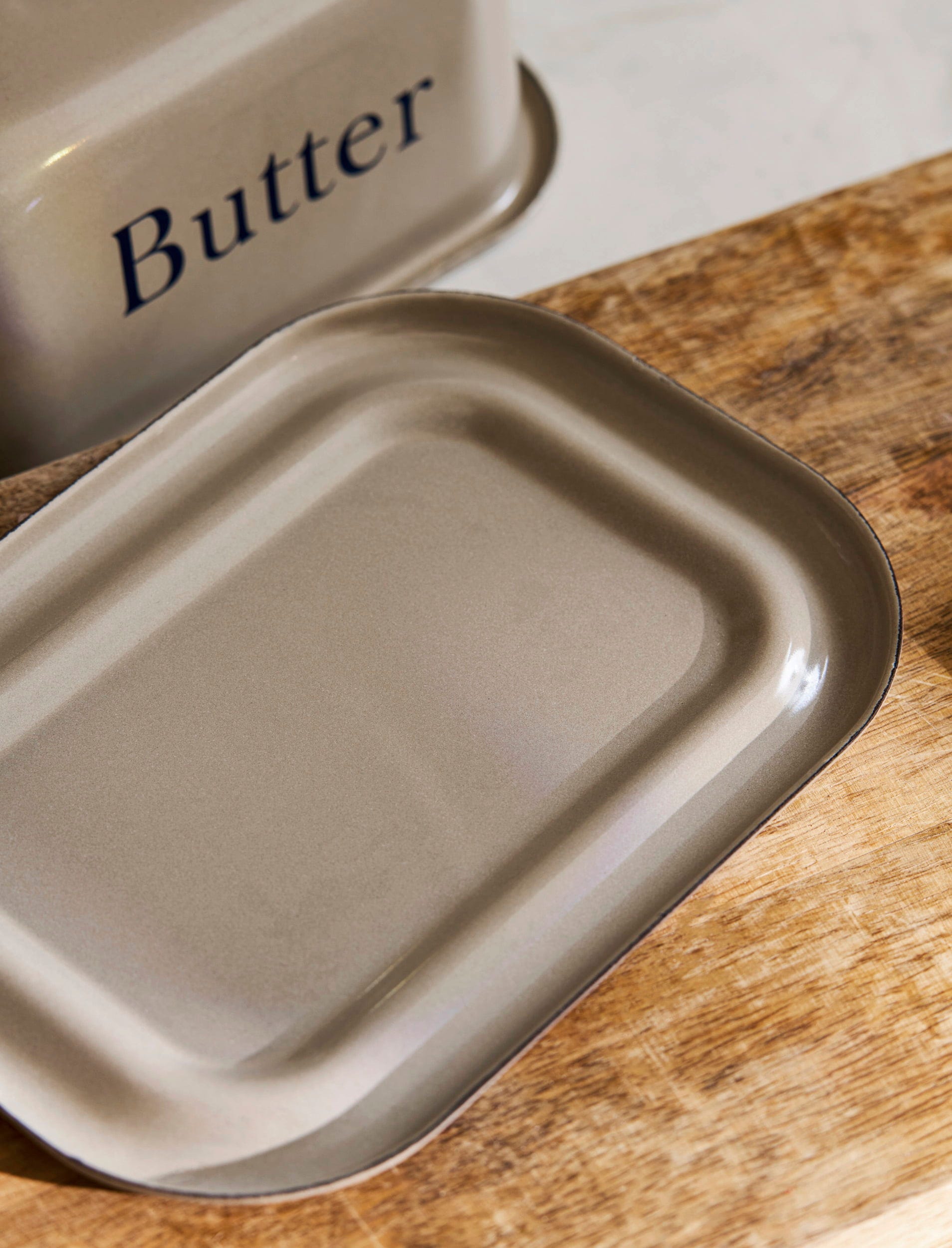Gefertigt aus langlebiger Emaille in einem warmen Trüffel-Farbton, eignet sich diese Butterdose ideal, um Butter im Kühlschrank, in der Vorratskammer oder direkt auf der Arbeitsplatte frisch zu halten sowie um sie auf ansprechende Weise zu servieren.
