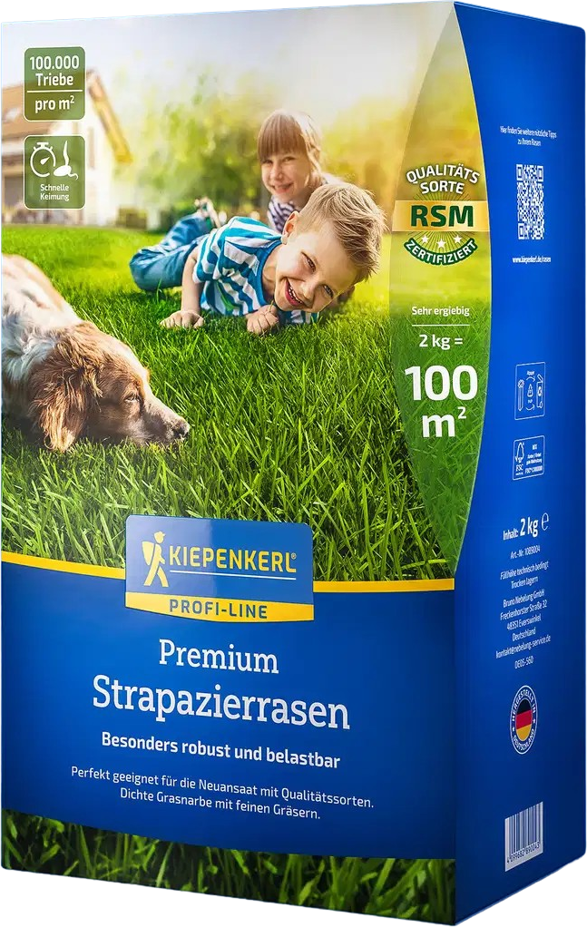 Der Premium Strapazierrasen aus der Kiepenkerl Profi-Line ist die perfekte Wahl, wenn du dir eine besonders robuste, dichte und tiefgrüne Rasenfläche wünschst. Die hochwertige Profimischung regeneriert sich schnell, hält starker Beanspruchung stand und bleibt auch bei intensiver Nutzung wunderbar gleichmäßig und gepflegt. Ideal für Familiengärten, Spielrasen oder jede Fläche, die einfach immer top aussehen soll.