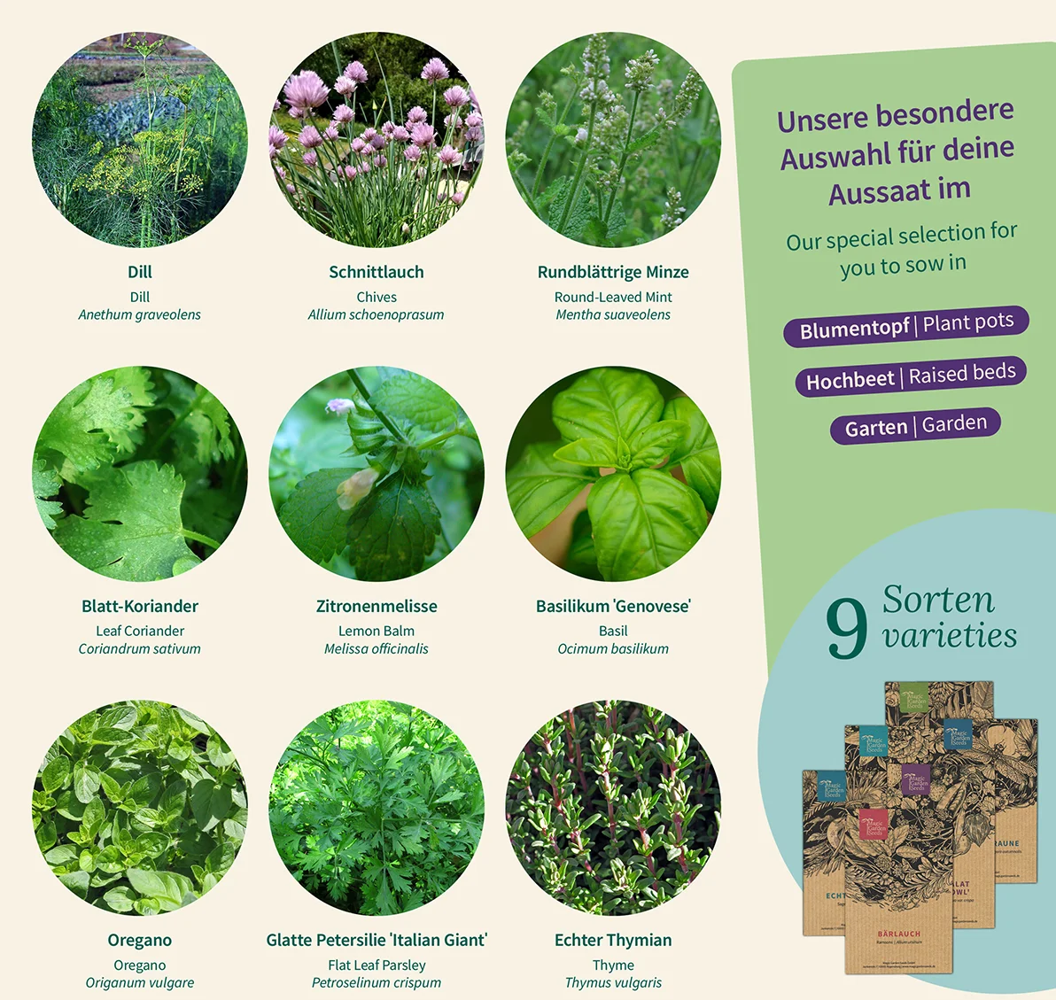 - 9 verschiedene Kräuter-Saatgutsorten