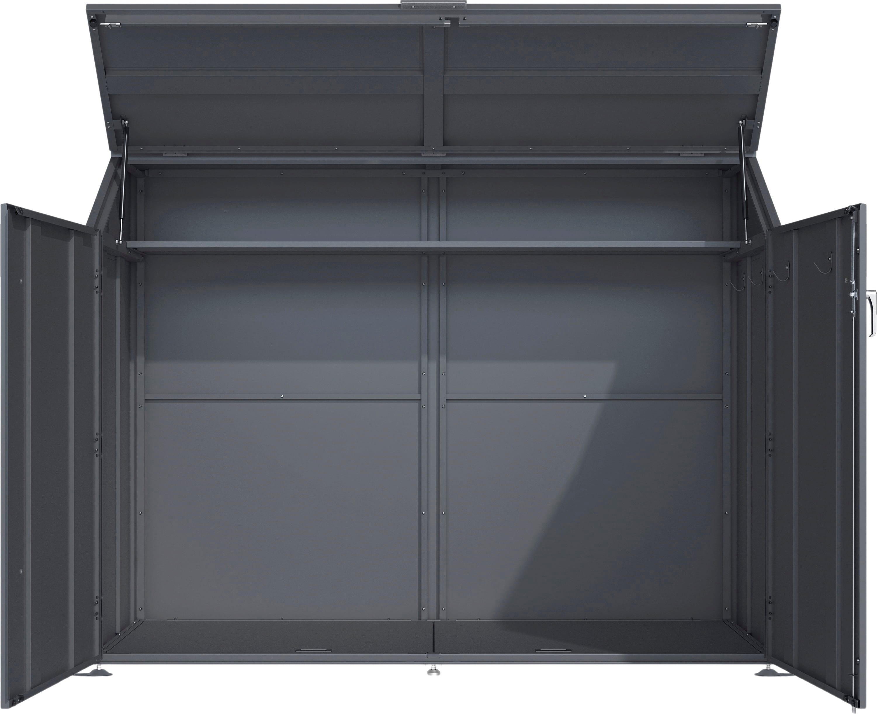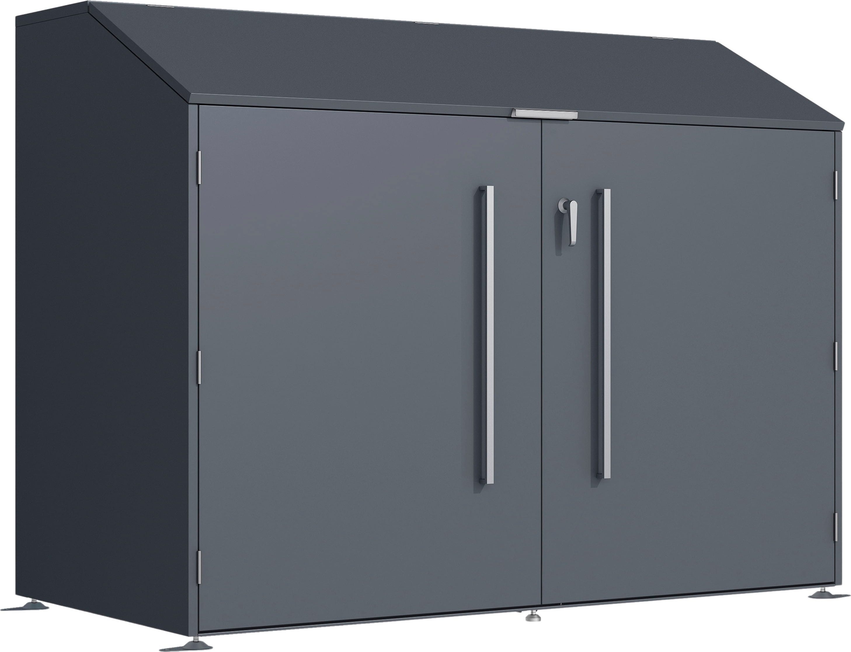 Zeitgenössische Farbgebung und minimalistisches Design in Kombination mit hoher Funktionalität machen dieses Produkt aus. Die Fahrradgarage Linea besitzt große Flügeltüren, die sich vollständig nach vorne öffnen lassen, um Fahrräder optimal rangieren zu können. Der Deckel lässt sich mit Gasdruckfedern nach oben öffnen und bietet damit vollen Zugriff auf das Regal, das Platz für Helme, Luftpumpe und anderes Zubehör bietet. Zusätzlich gewährleistet das integrierte Schloss aus Edelstahl Sicherheit vor unbefugtem Zugriff.