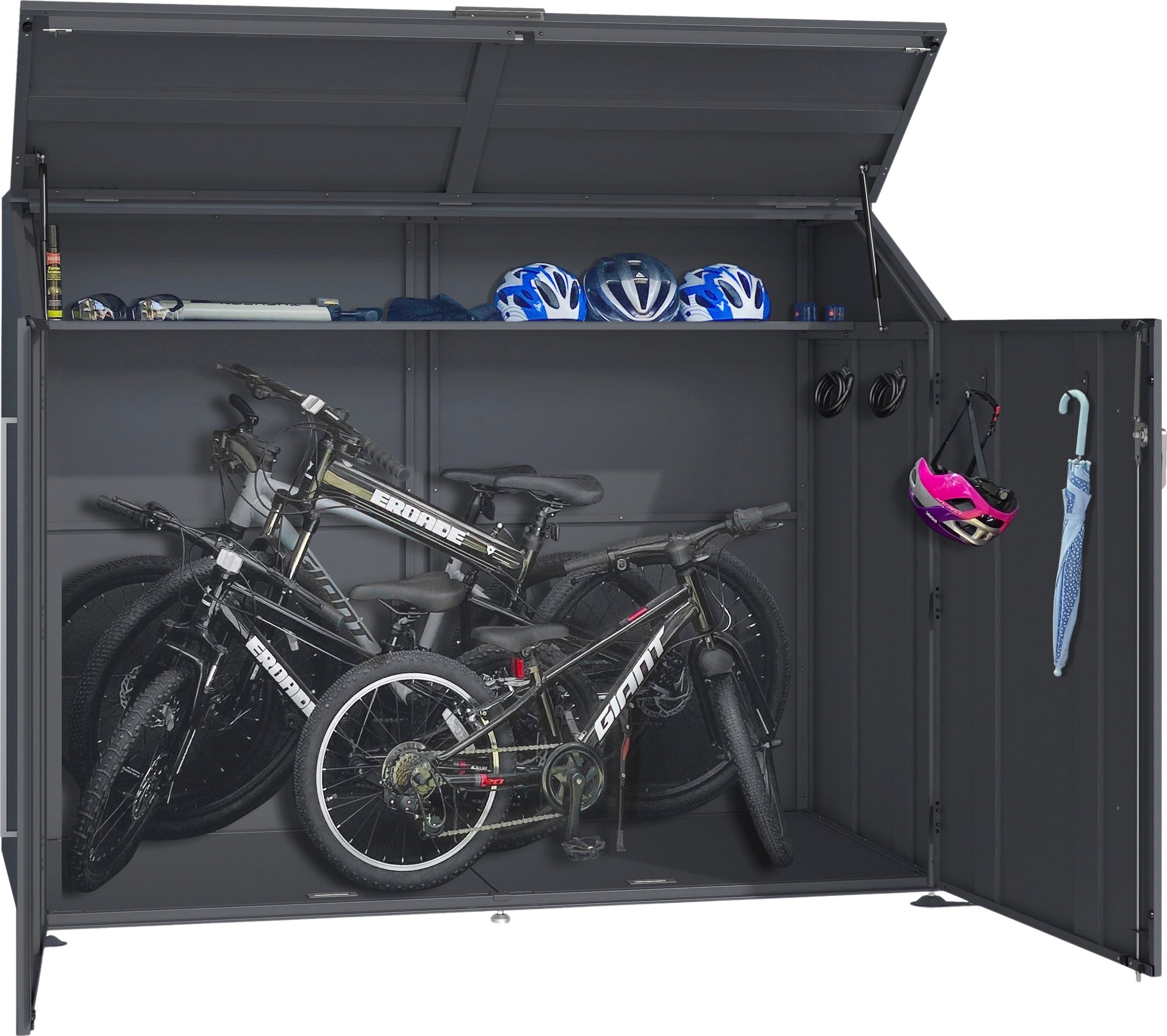 Expertentipp: Die Fahrradgarage lässt sich noch vielseitiger nutzen - sie kann problemlos als Gartenschrank oder als Mülltonnenbox eingesetzt werden. Dank der breiten Türen und des geschützten Innenraums finden Gartenwerkzeuge, kleinere Gartenmöbel oder zwei gängige Mülltonnen bequem Platz. Für eine flexible Stauraumlösung, die sich jederzeit an die Bedürfnisse anpasst.