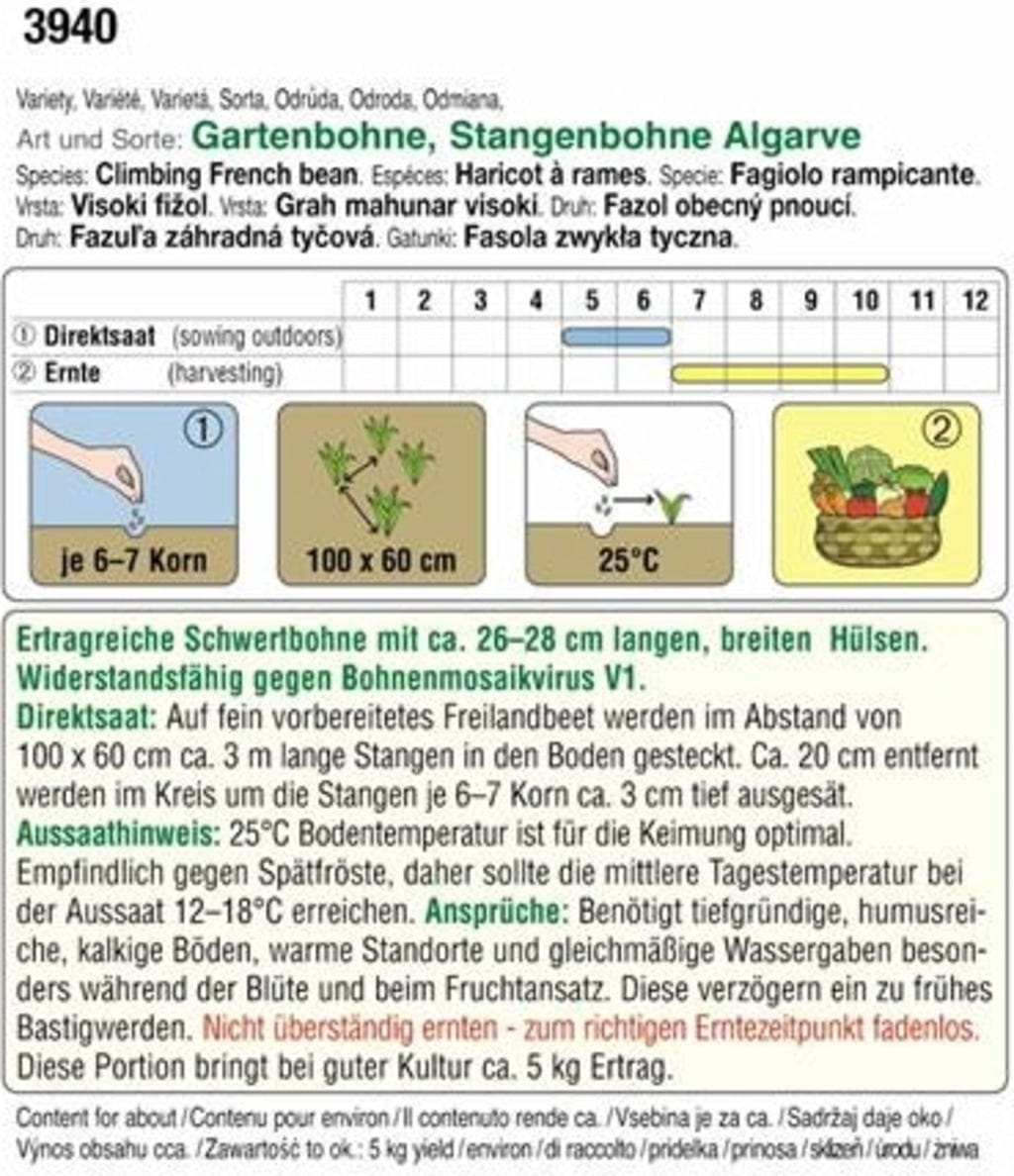 The "Algarve" pole bean delivers very high yields and produces pods approximately 26-28 cm long and relatively wide. These taste excellent when enjoyed in salads or as a side dish, and are also ideal for soups and stews. A major benefit of this variety is its resistance to the bean mosaic virus V1.