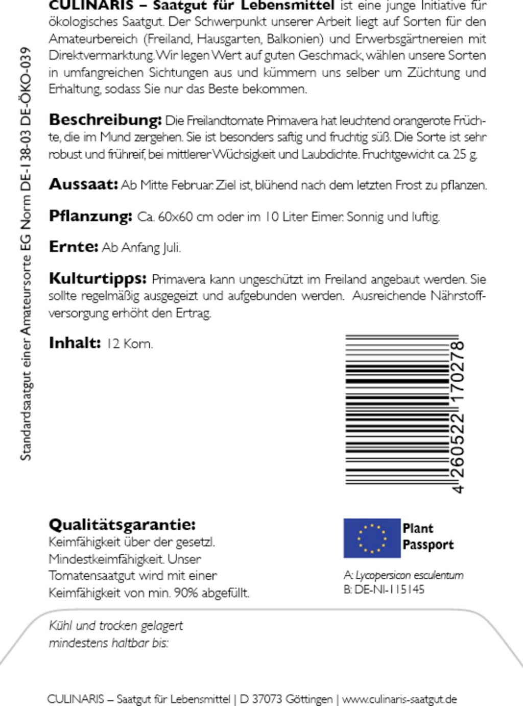 | Manufacturer: | Culinaris - Saatgut für Lebensmittel, Thiegasse 5, 37124, Rosdorf, Germany, info@culinaris-saatgut.de, culinaris-saatgut.de |