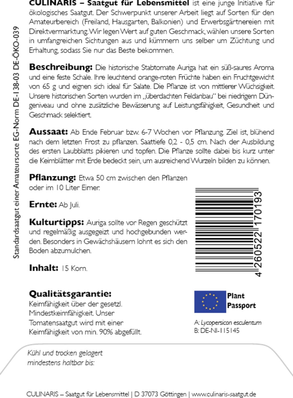 | Manufacturer: | Culinaris - Saatgut für Lebensmittel, Thiegasse 5, 37124, Rosdorf, Germany, info@culinaris-saatgut.de, culinaris-saatgut.de |