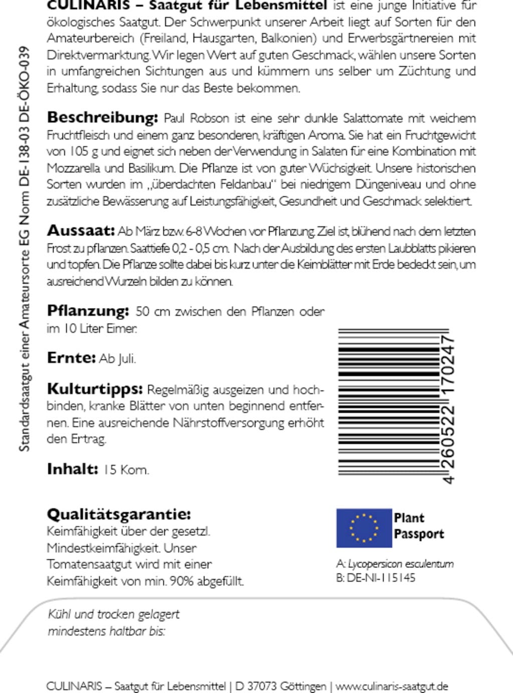 | Manufacturer: | Culinaris - Saatgut für Lebensmittel, Thiegasse 5, 37124, Rosdorf, Germany, info@culinaris-saatgut.de, culinaris-saatgut.de |