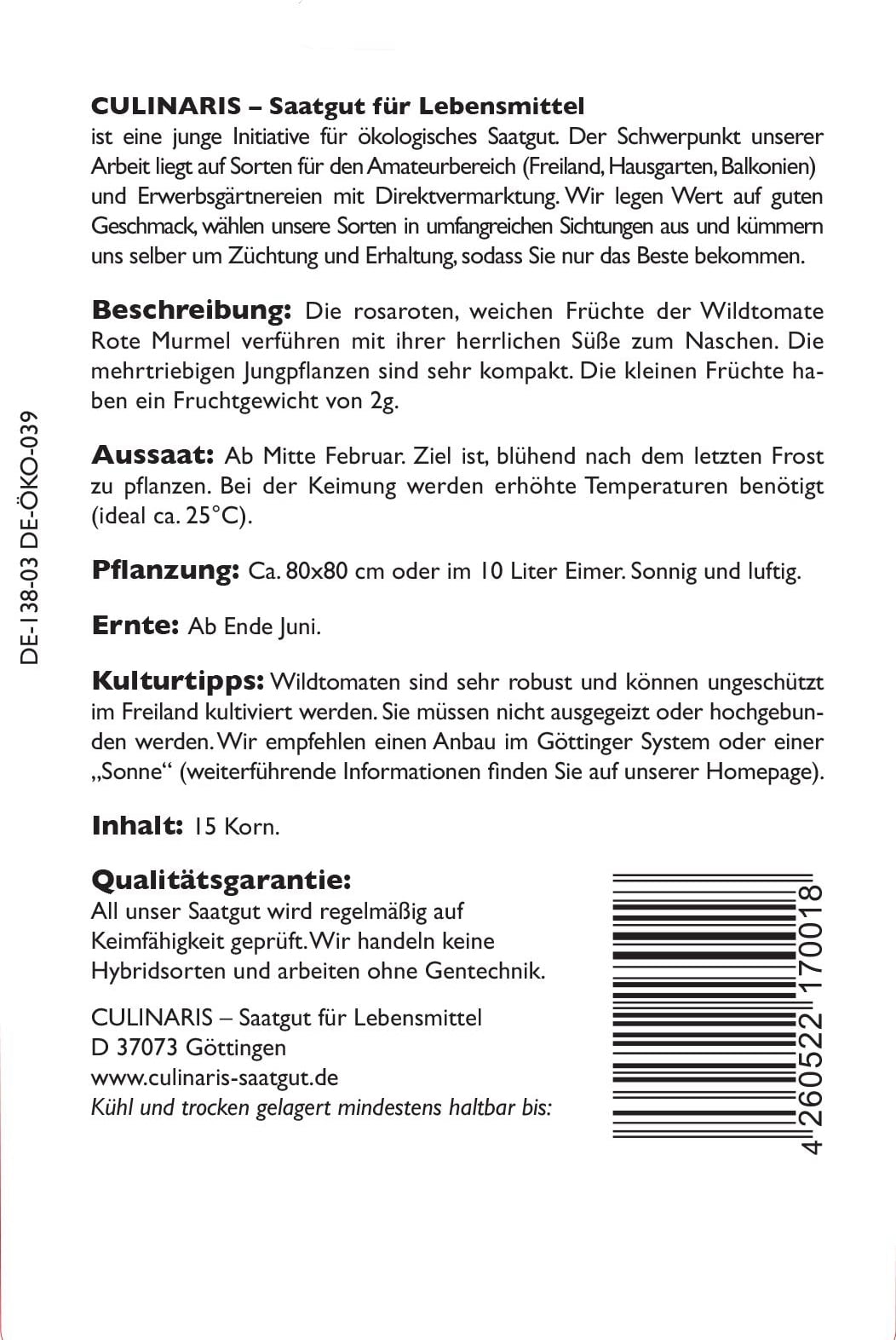 | Manufacturer: | Culinaris - Saatgut für Lebensmittel, Thiegasse 5, 37124, Rosdorf, Germany, info@culinaris-saatgut.de, culinaris-saatgut.de |
