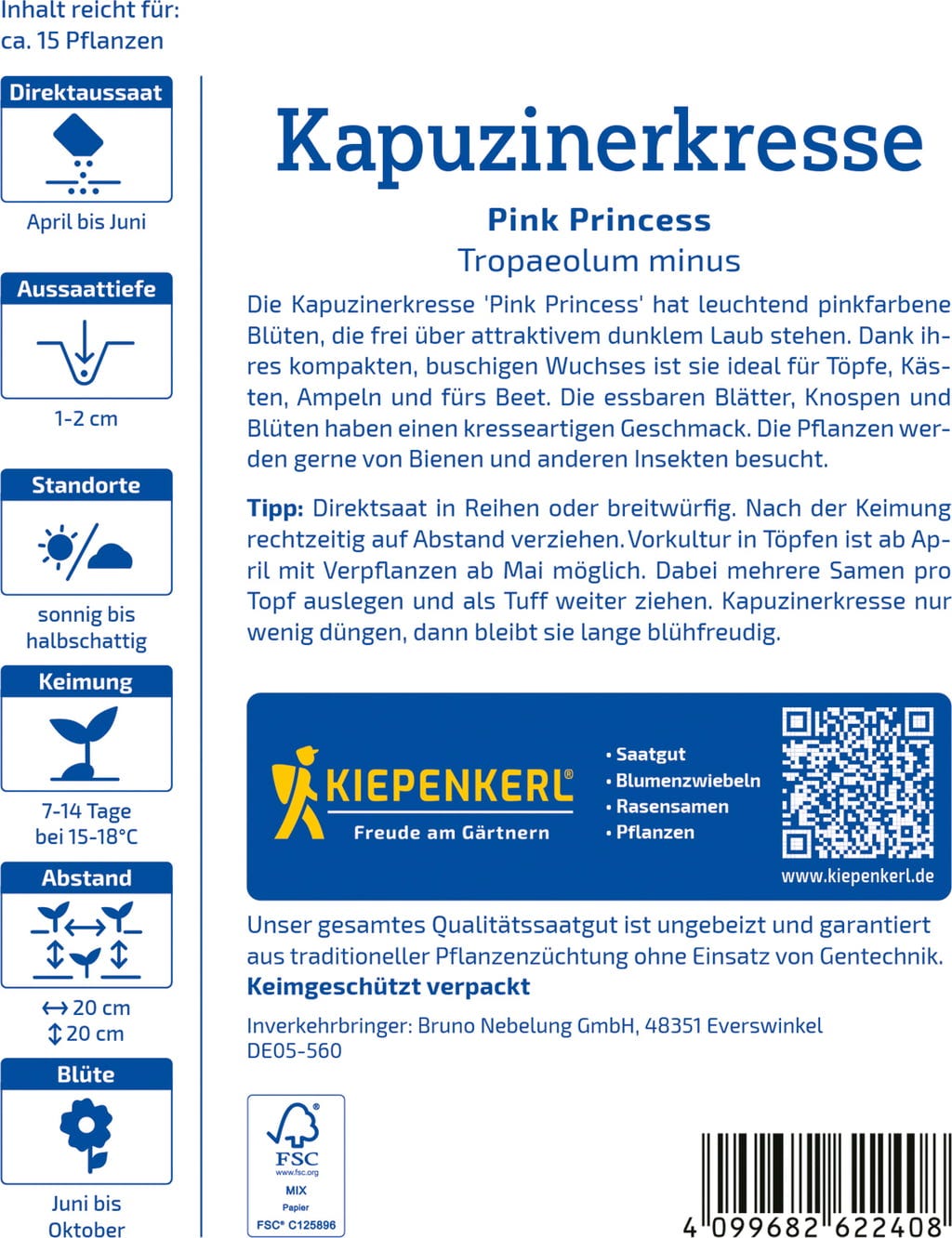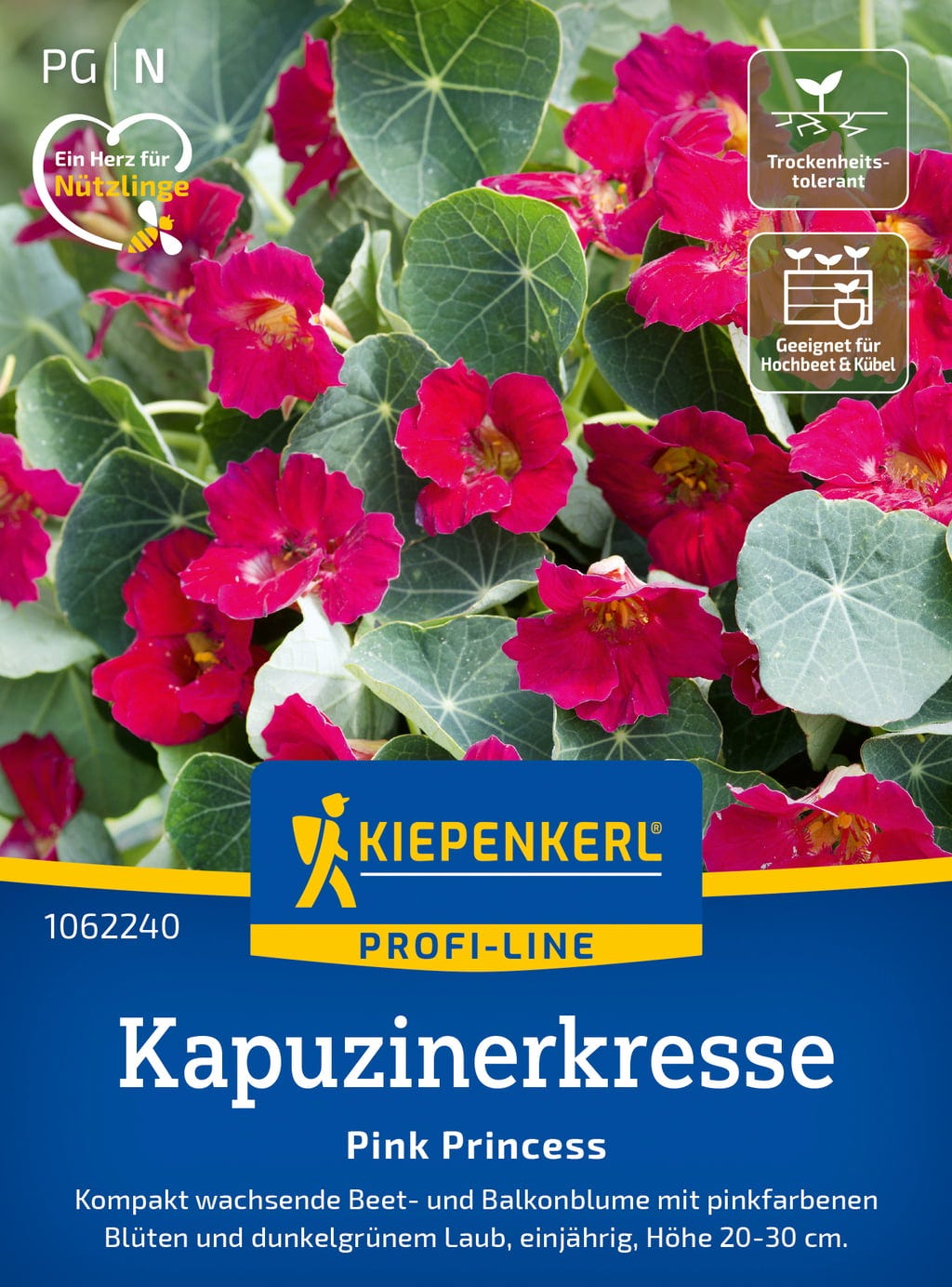 The "Pink Princess" nasturtium produces flowers with bright pink petals, which provide an excellent contrast to its dark foliage. It is particularly effective in pots, containers and hanging baskets, thanks to its compact growth. A feast for the eyes and insect-friendly too.