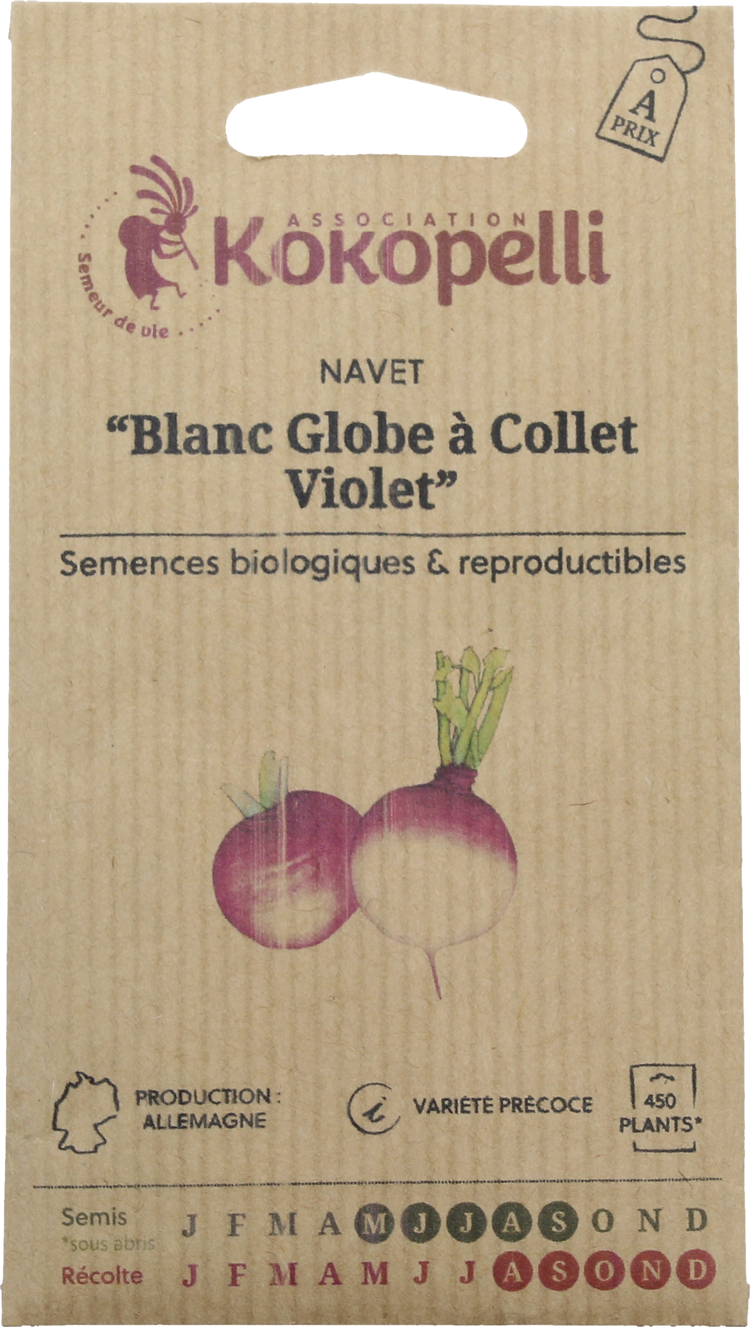 "Purple Top White Globe" turnip produces white roots with a violet crown, firm flesh and a mild flavour. Hardy and suitable for storage, it is ideal for harvests from late summer through winter.
