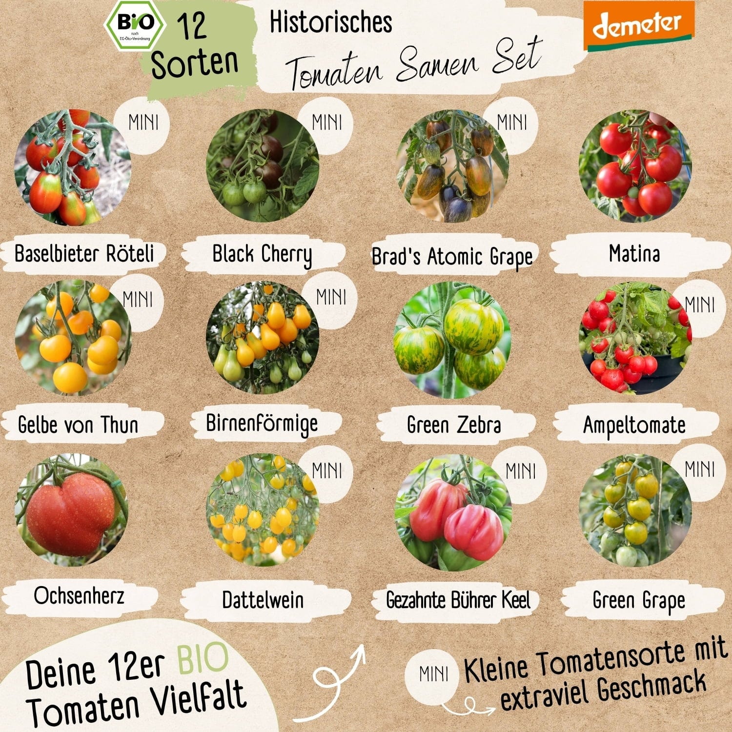 The set contains seeds for the following heirloom tomato varieties:
