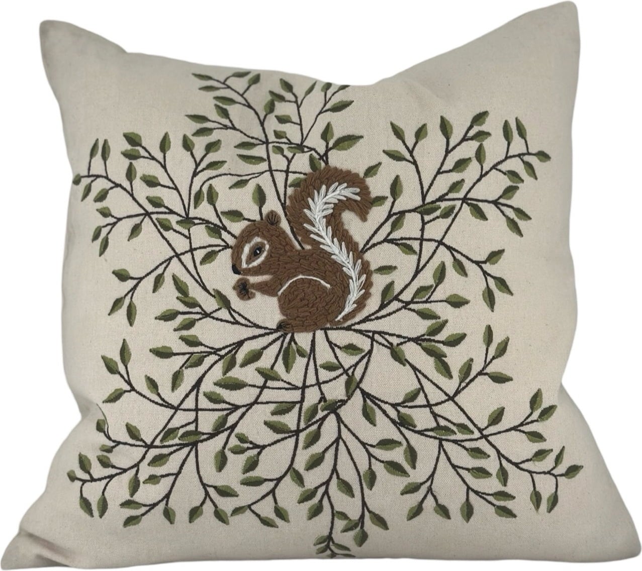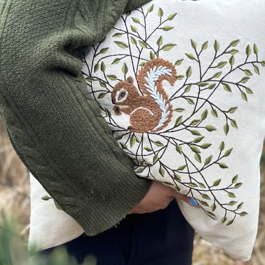 The “Sciurus” cushion cover brings woodland charm straight to your sofa. A lovingly embroidered squirrel motif, surrounded by green branches and brown leaves, creates a cosy atmosphere. Made from 100% cotton.