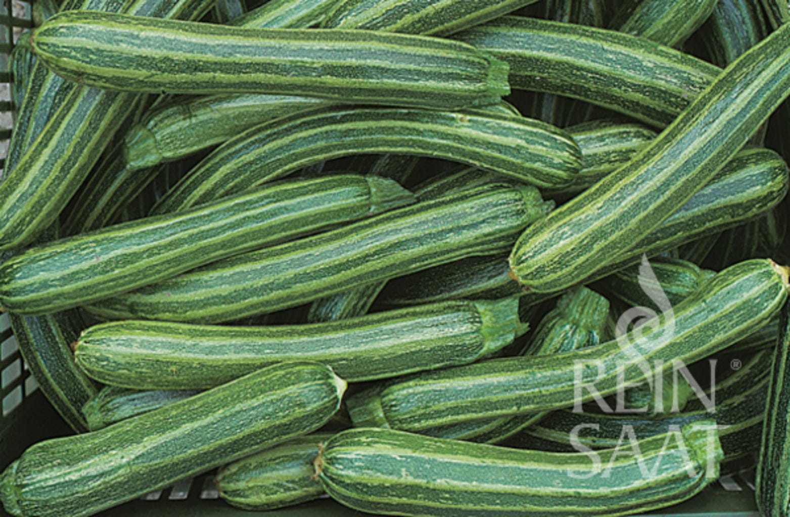 This medium-early, vigorously growing variety produces beautifully shaped, dark green marbled fruits with striking light stripes. Its white flesh delights with an aromatic flavour and remains firm to the bite even when cooked.