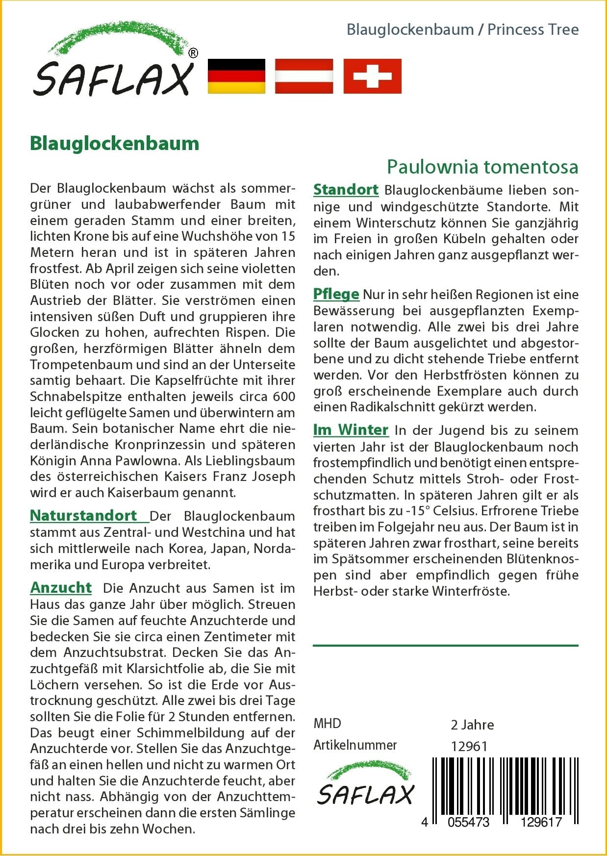 The Empress Tree is a deciduous hardwood tree that bears violet blossoms with an intense, sweet fragrance starting in April. It features an airy crown and can reach an impressive height of up to 15 metres. In its younger years, the tree requires winter protection; however, once established, it is frost-hardy down to -15°C.