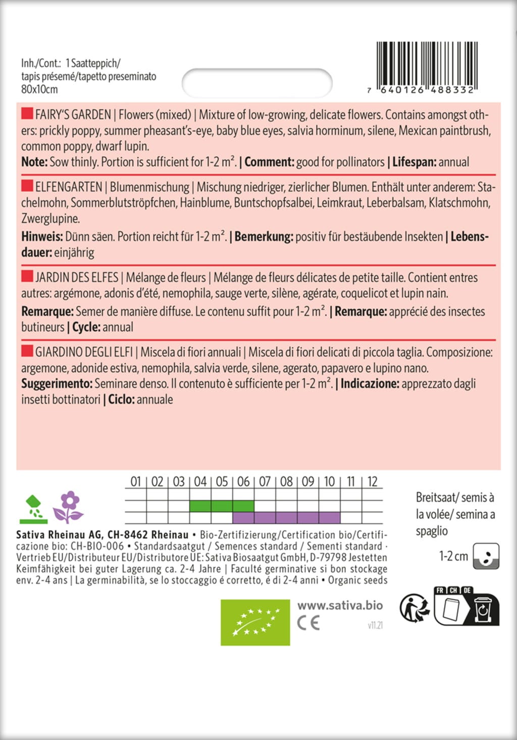 The name "Elfengarten" lives up to its promise - this delightful flower mix contains delicate and low-growing flowers that are irresistible to bees and other pollinators. Using the seed carpet (80 x 10 cm), sowing is incredibly easy as the seeds are already arranged at the correct spacing. Therefore, additional thinning or pricking out is not necessary.