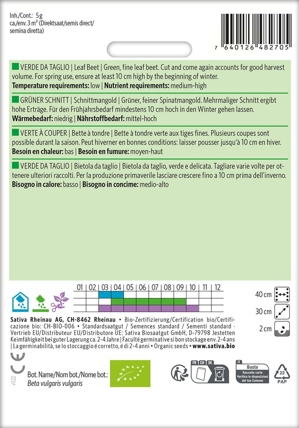 A wonderful variety of chard with fine, green leaves that can be harvested multiple times, providing high yields. For spring requirements, allow the plants to enter winter at a height of approx. 10 cm. The heat requirement is low, and the nutrient requirement is medium to high.