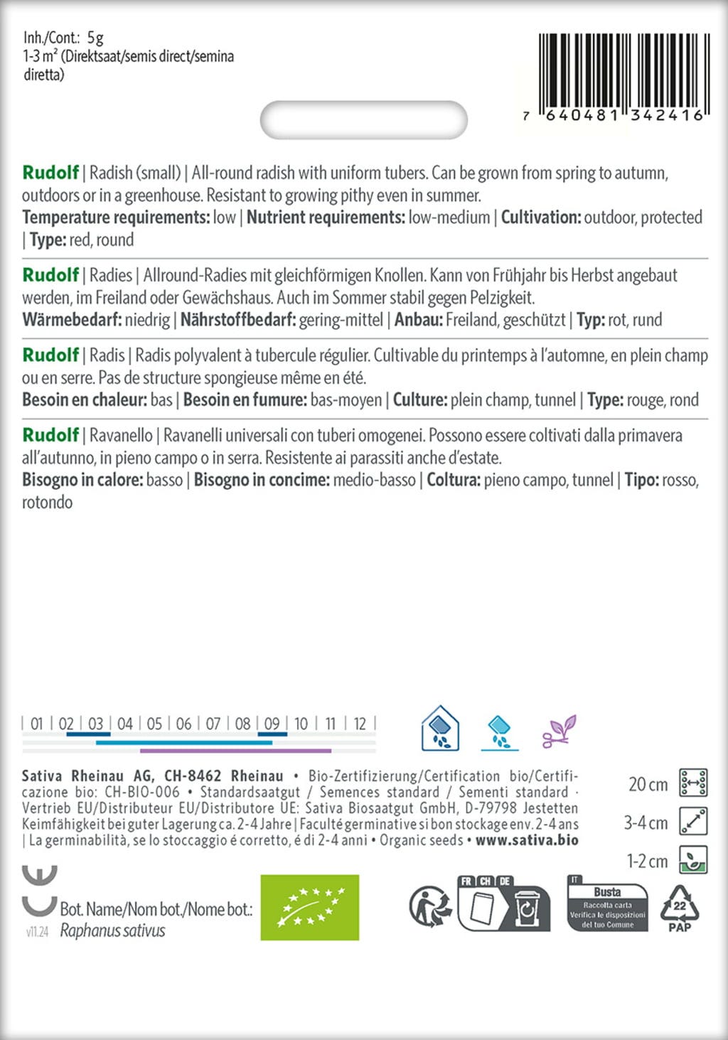 The Rudolf radish variety has uniform, crisp tubers and is a true all-rounder for spring to autumn. It is easy to grow outdoors and in a greenhouse. It is resistant to becoming woody during summer.