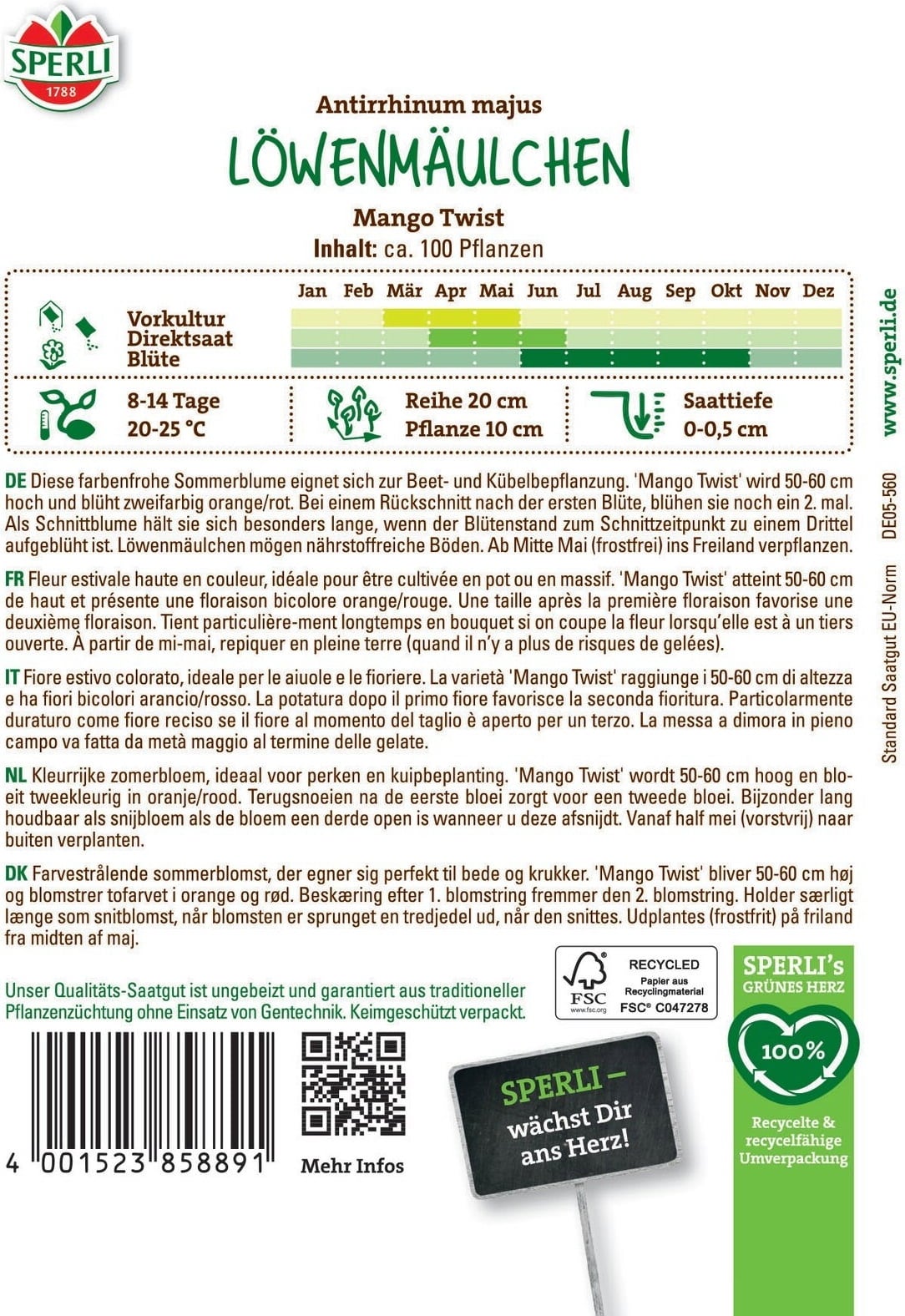 The 'Mango Twist' snapdragon variety, featuring vivid orange-red blossoms, has an almost tropical flair and is an eye-catching addition to flower beds and containers. The flowers are also striking as cut flowers and are long-lasting in a vase.