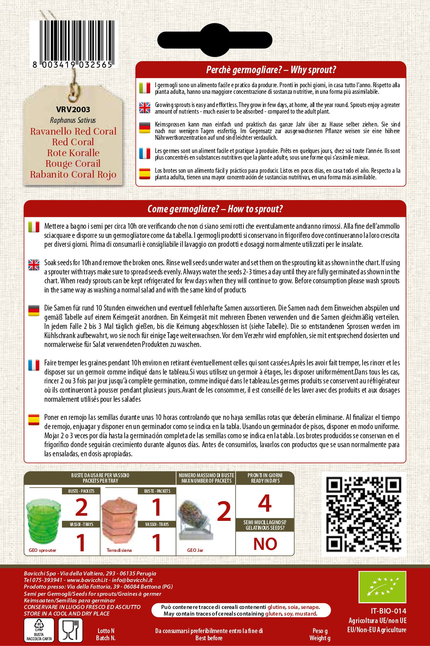 Bavicchi Graines de Pousses Germées de Radis "Rouge Corail" Bio, 20 g