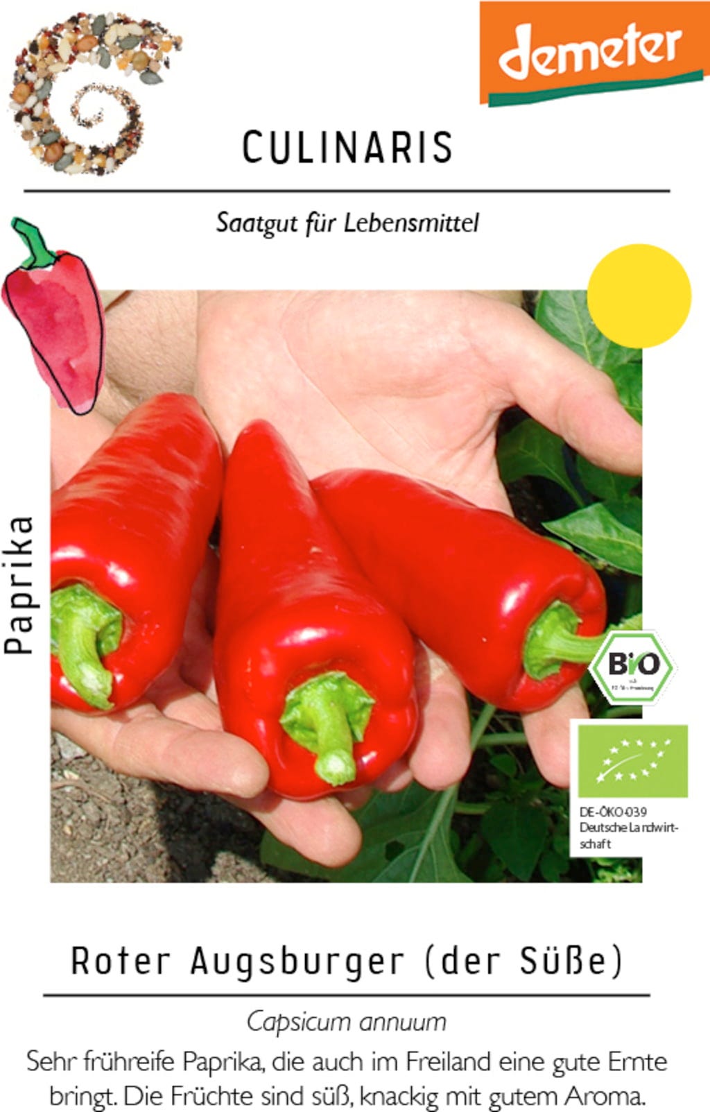 Le Poivron Bio "Augsburger Rouge" se distingue par sa maturité précoce et ses rendements fiables et généreux, même en pleine terre. Ses fruits sucrés et pointus sont particulièrement aromatiques et polyvalents en cuisine, mais conviennent également parfaitement comme en-cas.