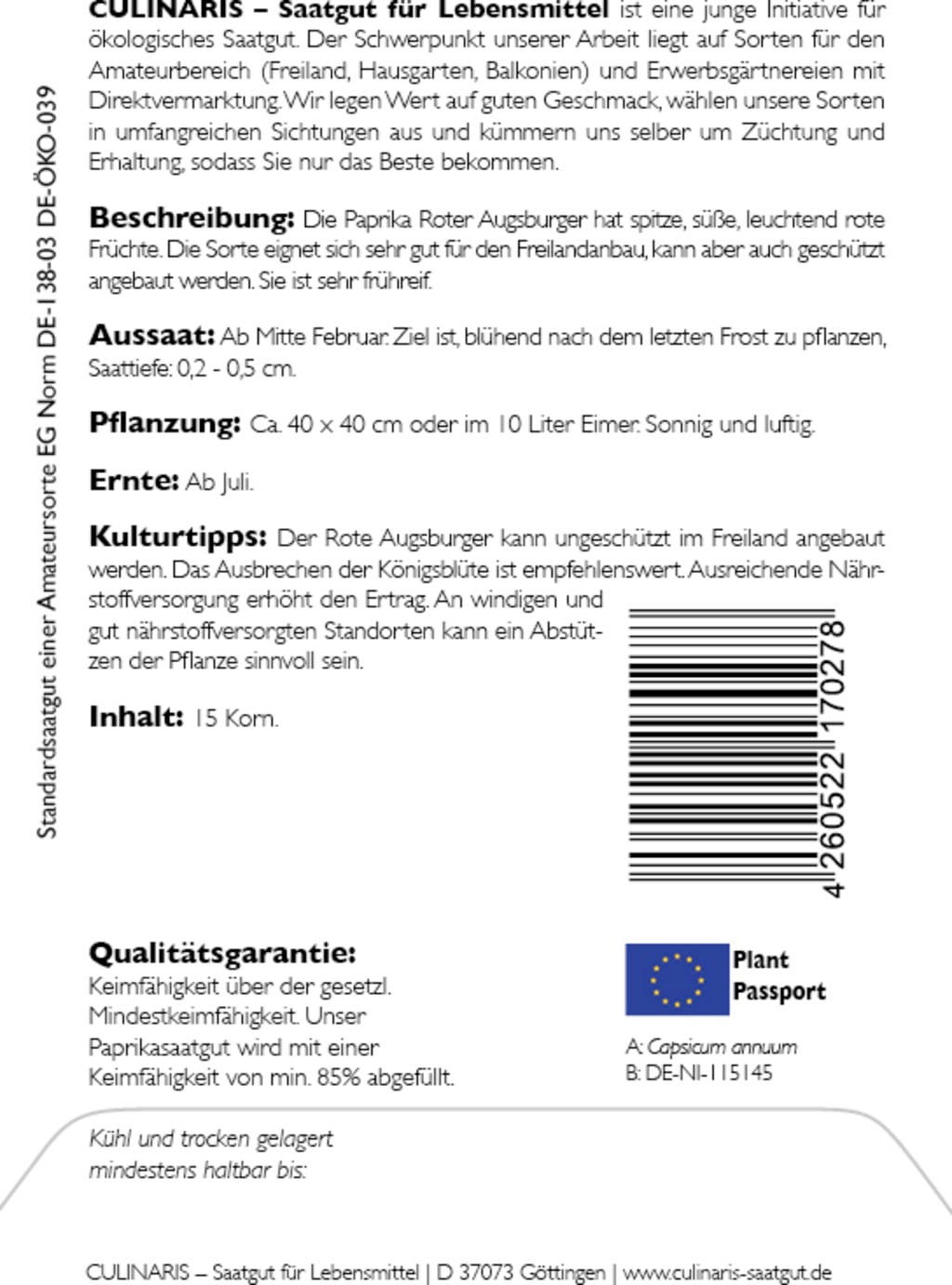 | Fabricant: | Culinaris - Saatgut für Lebensmittel, Thiegasse 5, 37124, Rosdorf, Allemagne, info@culinaris-saatgut.de, culinaris-saatgut.de |