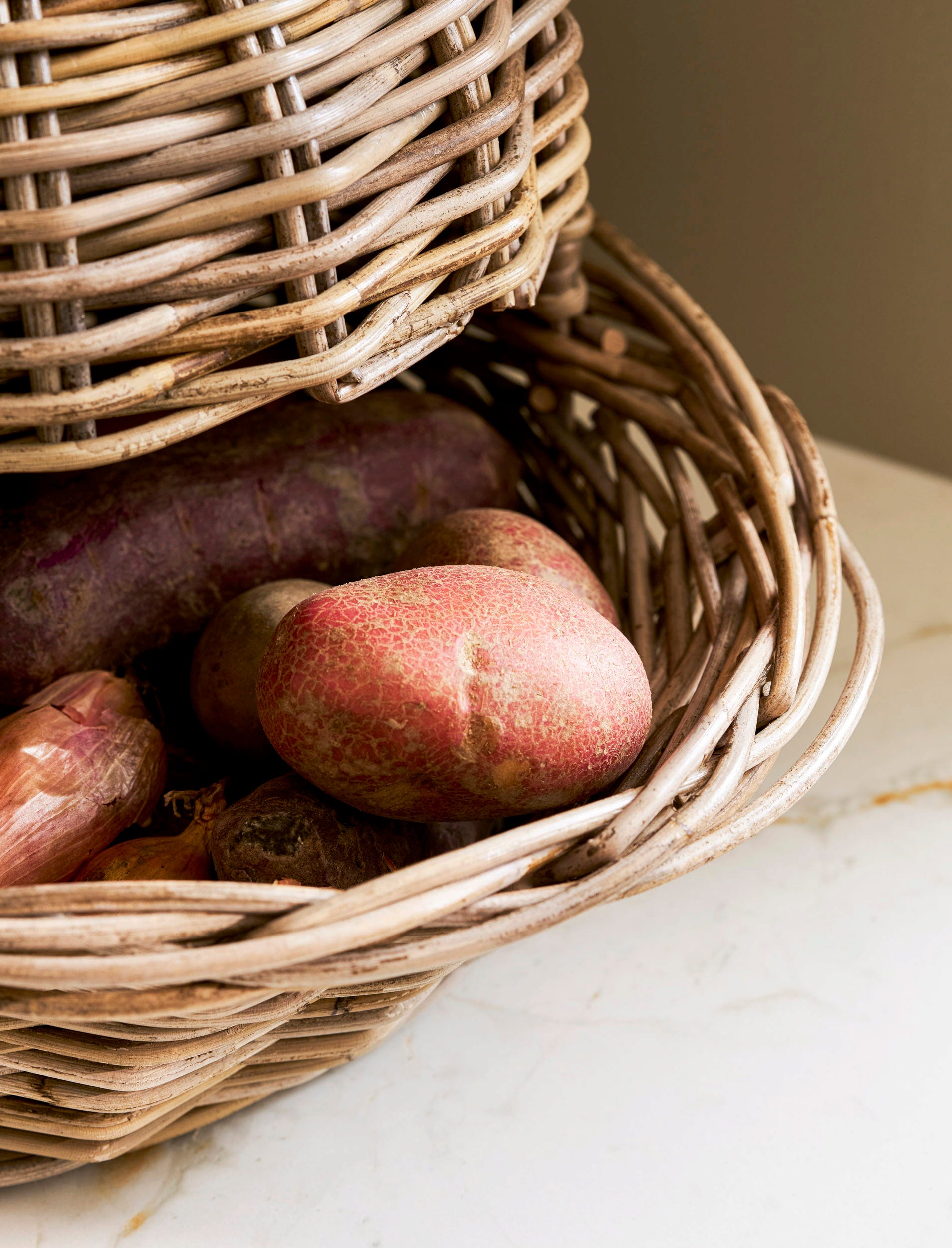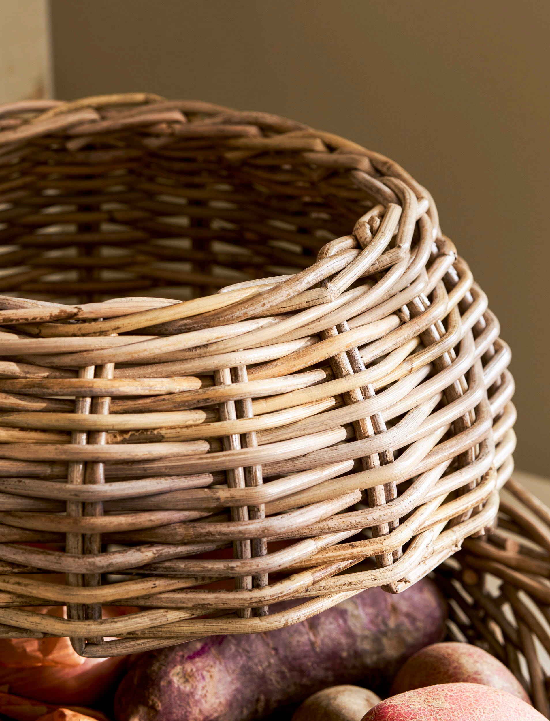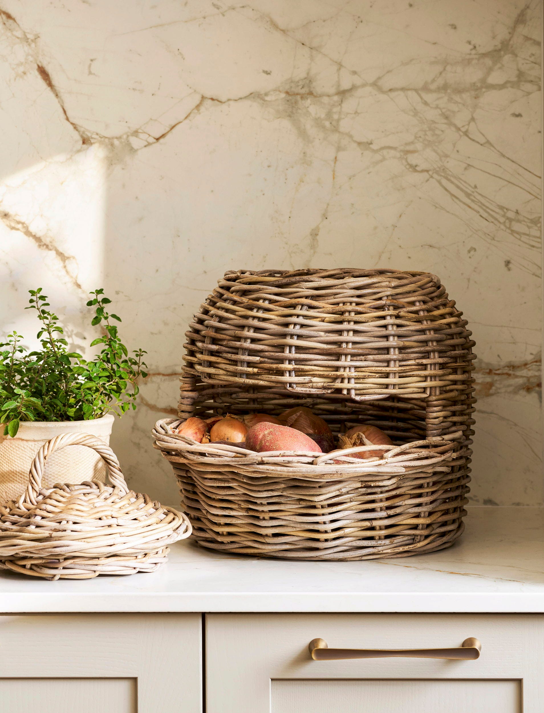 Parfait pour une cuisine chaleureuse au style maison de campagne : ce garde-légumes est idéal pour conserver des légumes tels que pommes de terre, oignons et carottes. Tressé à la main en rotin rustique, il constitue un véritable atout esthétique pour tout garde-manger et toute cuisine.