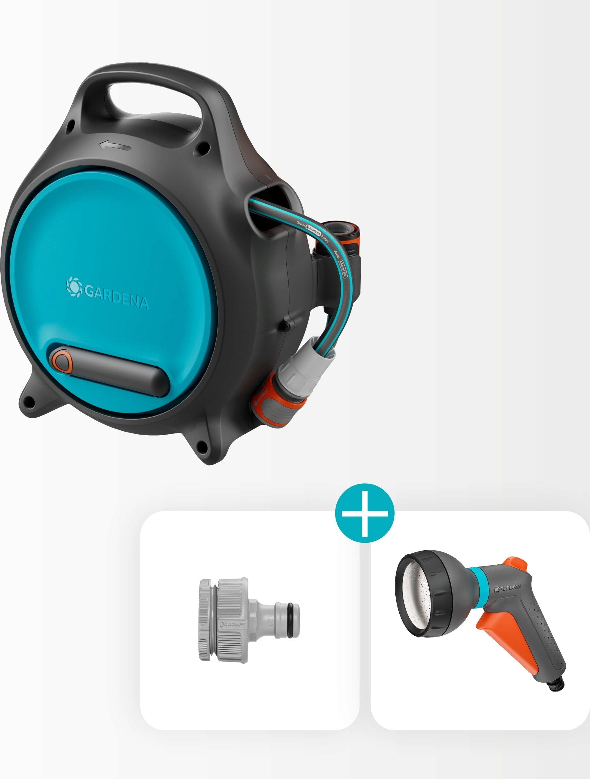 1 x Dévidoir Portable Move avec tuyau de 10 m (8,5 mm), 1 x lance Classic, 1 x raccord de robinet avec adaptateur, 1 x support pour accessoire