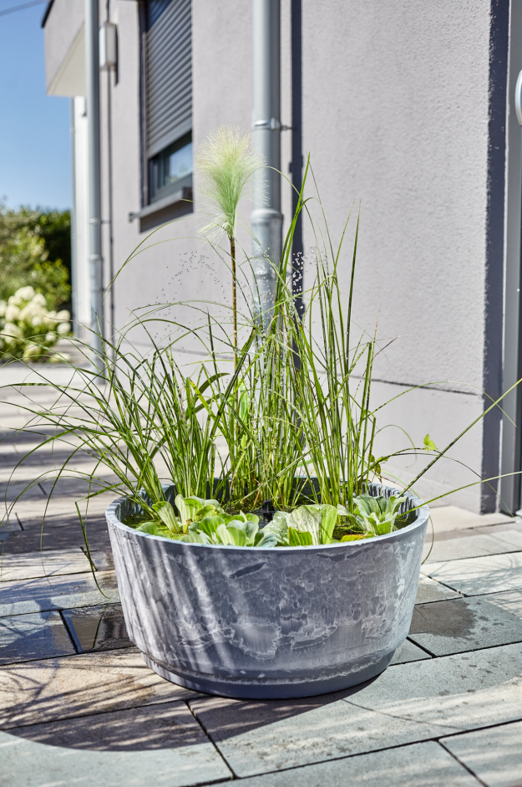 Le jardin aquatique HEISSNER transforme tout espace extérieur en un lieu agréable et relaxant, tout en contribuant à améliorer le microclimat ambiant. Grâce à la pompe alimentée par énergie solaire, l’écoulement doux de l’eau crée une atmosphère naturelle sans consommation d’électricité. La mise en place est particulièrement simple : il suffit de remplir le récipient d’eau, d’y ajouter des plantes et de profiter de l’effet décoratif. Même dans les espaces réduits, il est possible de créer un point d’eau élégant, offrant une précieuse source pour les insectes utiles et les petits animaux.