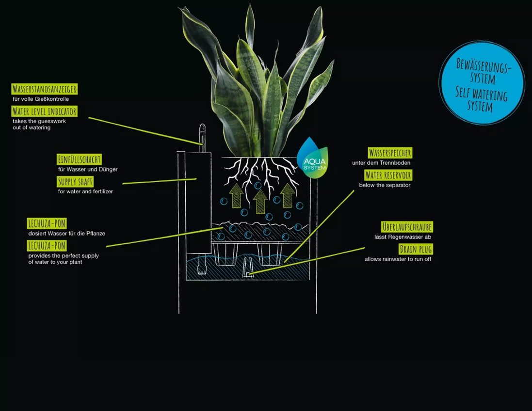 - Le système d'irrigation original LECHUZA intégré fournit de l'eau aux plantes de manière optimale.