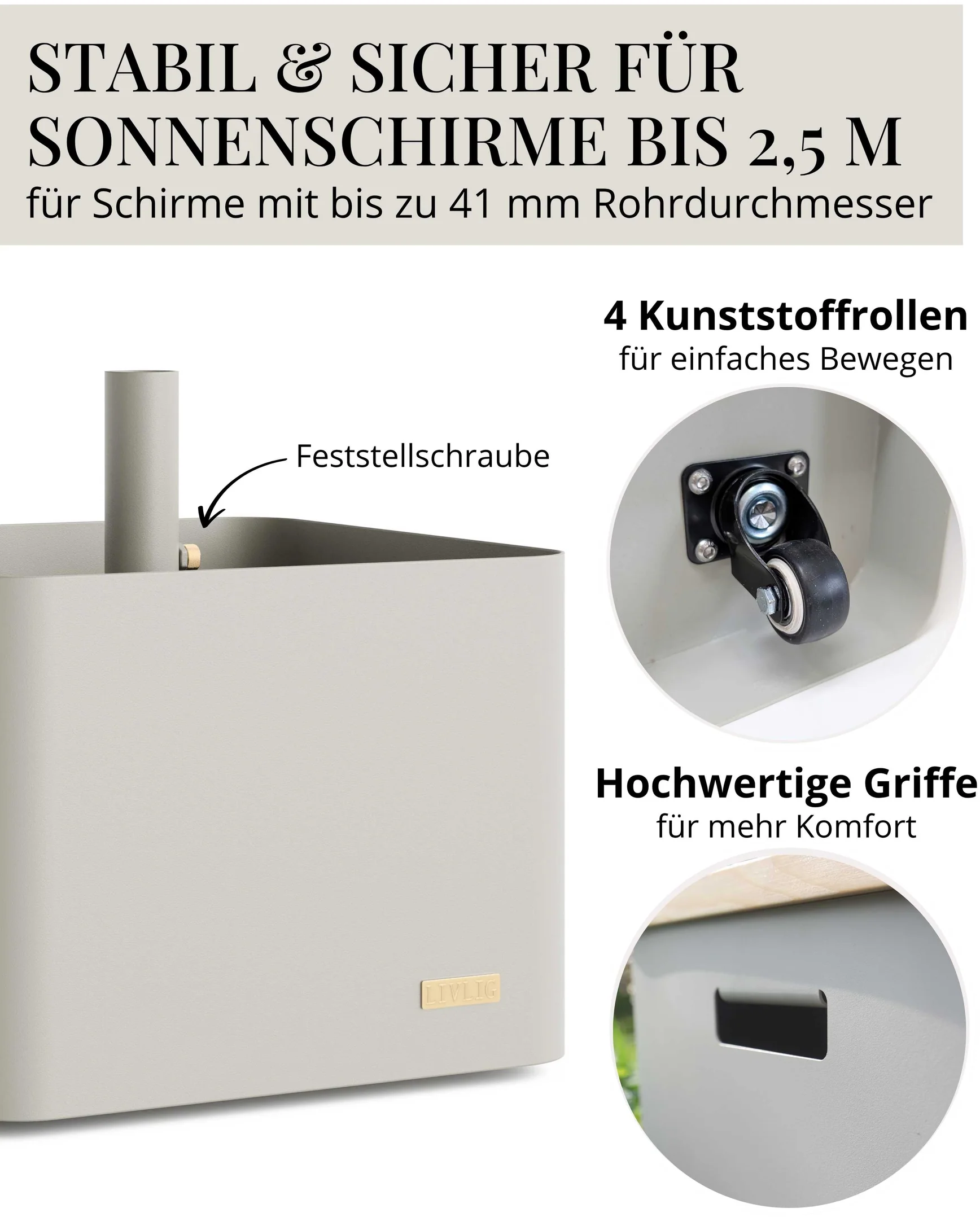 La solution 3-en-1 idéale et peu encombrante pour balcon et terrasse ! Ce support mobile assure un maintien optimal au parasol et peut être rempli ou planté de façon décorative pour plus de stabilité. Il peut également faire office de table d’appoint.
