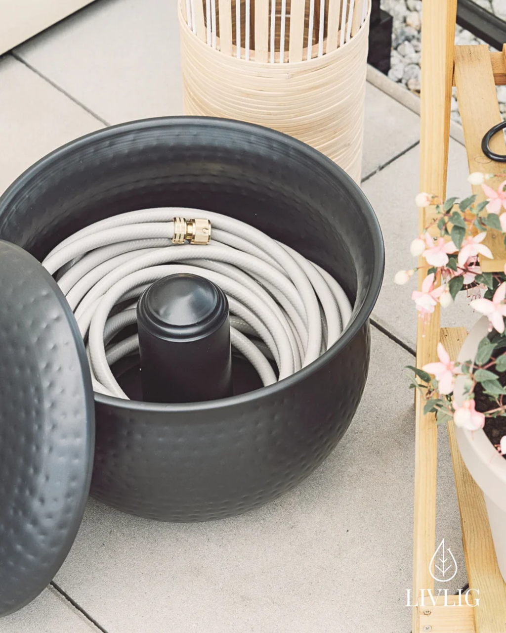 Le Pot à Tuyau Martelé LIVLIG est la solution idéale pour mettre fin aux tuyaux d’arrosage en désordre. Une forme de rangement élégante. Sa texture martelée lui confère une esthétique remarquable et transforme un simple accessoire de rangement en véritable élément décoratif sur la terrasse, le balcon ou dans le jardin. Le pot peut accueillir jusqu’à 20 m de tuyaux flexibles. Grâce à son couvercle adapté, le contenu est protégé de manière fiable contre les intempéries.