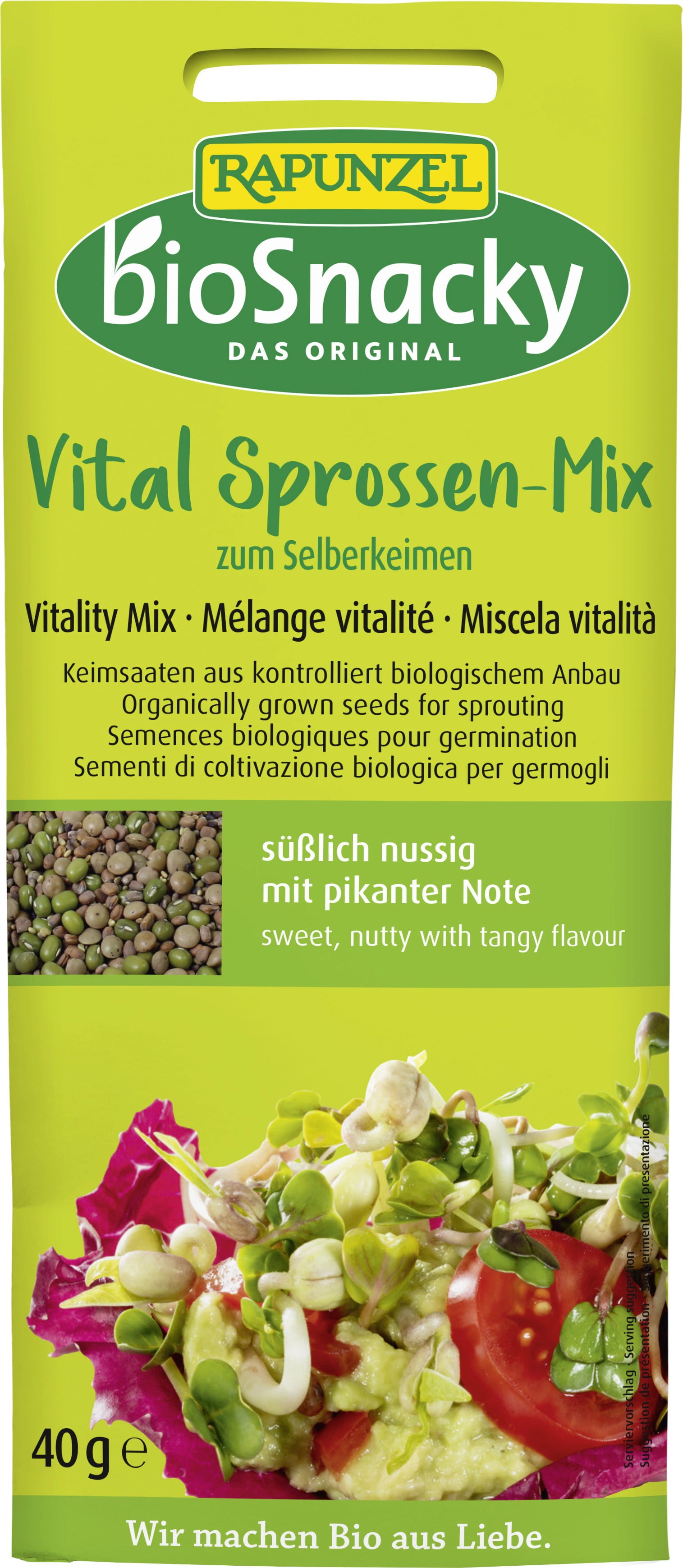 Le mélange Vitalité de Rapunzel est parfait pour faire pousser des germes chez vous, sur le rebord de la fenêtre. Le mélange de semences de lentilles, de radis, de haricot mungo et de trèfle rouge est idéal comme garniture dans les salades, sur le pain ou dans le fromage à la crème car les pousses ont des saveurs variées qui vont de sucré à légèrement épicé, avec de délicates notes de noisette.