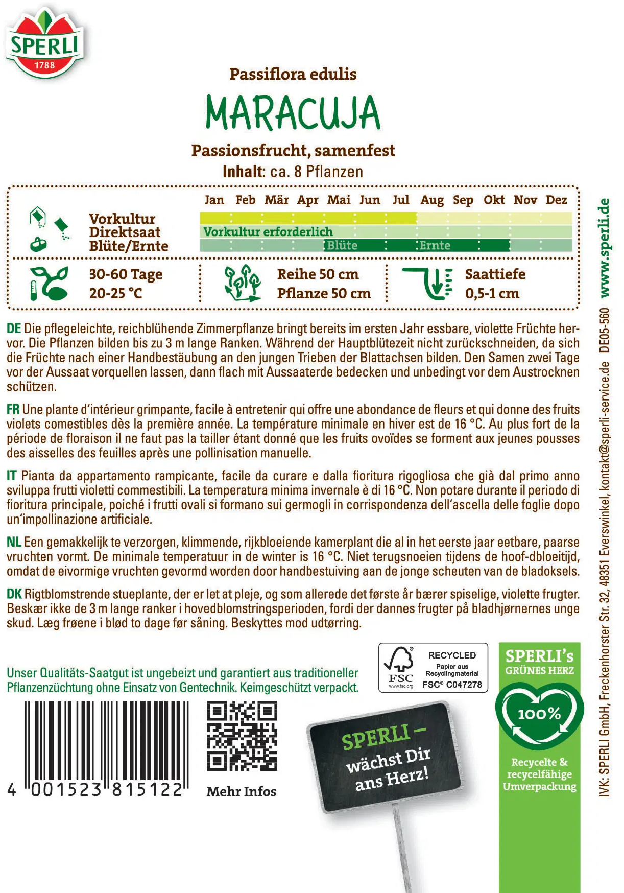 Le maracuja (fruit de la passion) de SPERLI est une rareté à cultiver chez soi. Cette plante grimpante se plaît en pot, fleurit abondamment et produit à partir d’août des fruits violets comestibles. Pour une bonne fructification, ne pas tailler pendant la période de floraison et effectuer une pollinisation manuelle. Le semis s’effectue de janvier à juillet : faire tremper les graines deux jours et les maintenir humides.