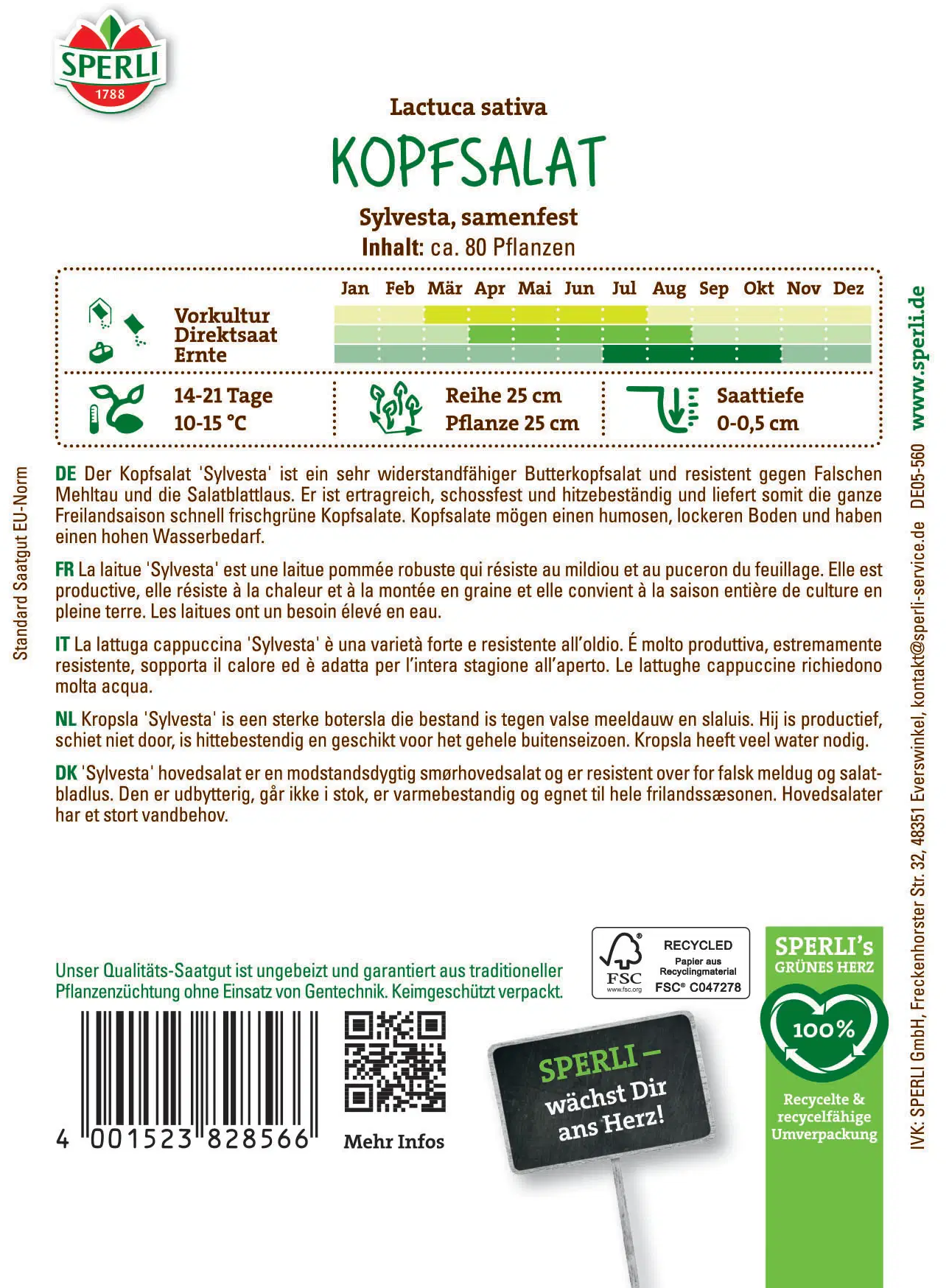 La laitue pommée "Sylvesta" de SPERLI est particulièrement robuste, productive et résistante au mildiou ainsi qu’aux pucerons. Elle résiste à la montée en graine, supporte bien la chaleur et offre toute la saison des têtes croquantes et vert clair. Parfaite pour les débutants comme pour les jardiniers expérimentés.