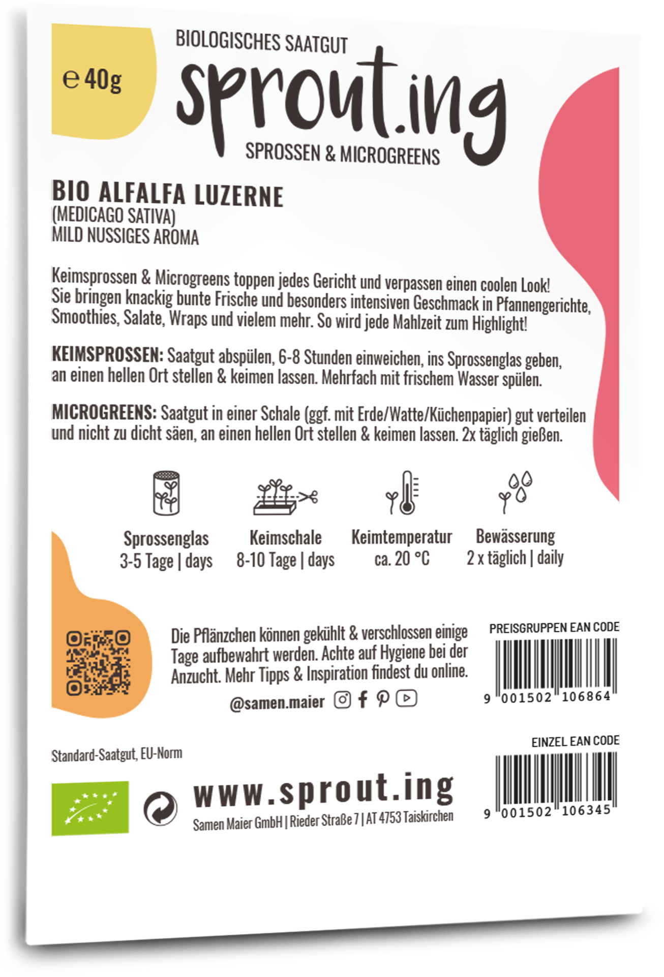 La luzerne, sous forme de pousses germées ou de microgreens, apporte de la variété dans ta cuisine. Elles sont faciles et rapides à cultiver chez soi et apportent une fraîcheur croquante et colorée dans l'assiette. Leur doux arôme de noisette se marie bien avec les poêlées, les smoothies, les salades, les wraps et bien plus encore.