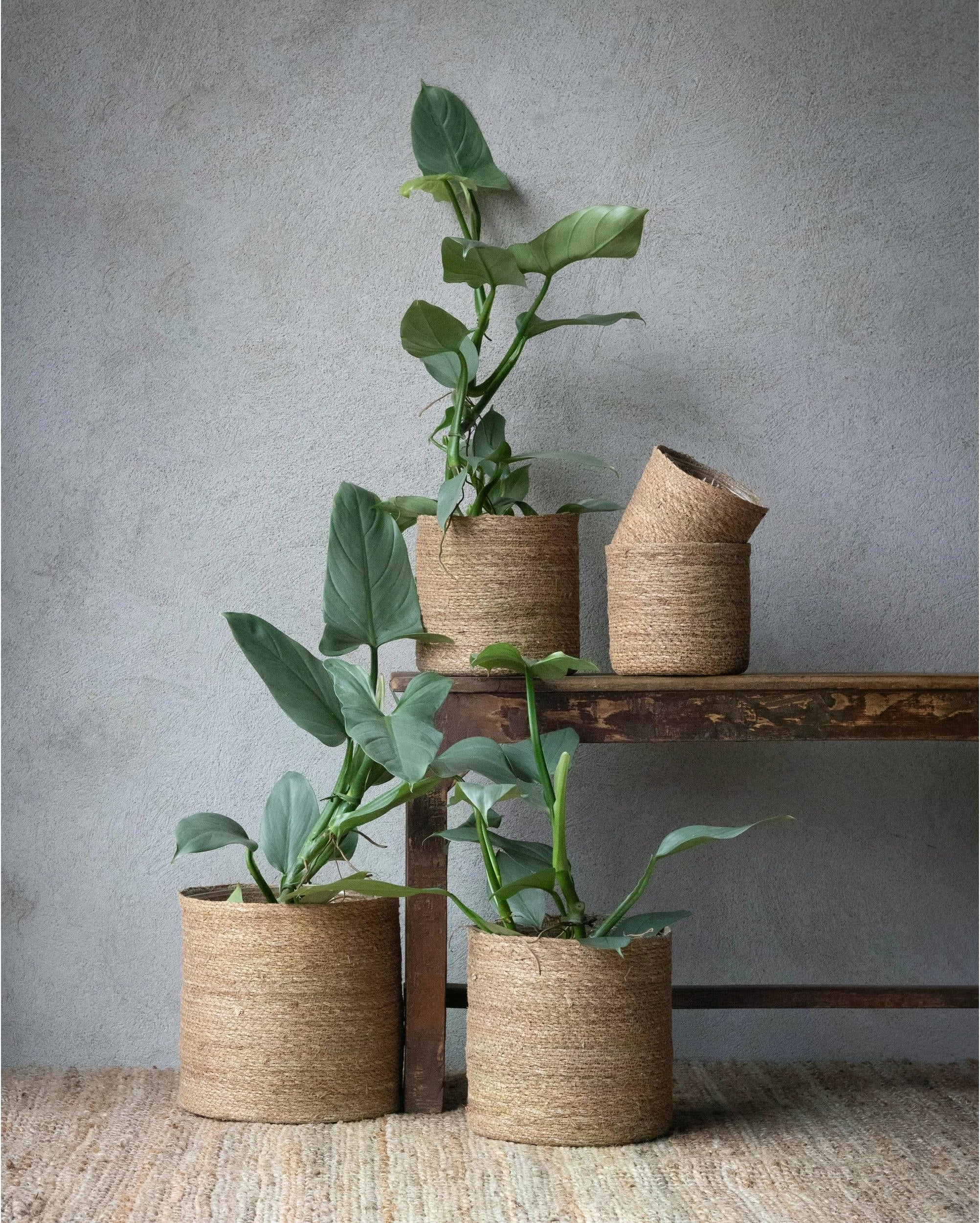 Que ce soit comme pot à plantes ou panier de rangement, cet ensemble en jacinthe d'eau naturelle séduit par son charme authentique : un bel ajout aux intérieurs décorés avec style, auquel il apporte une touche bohème.