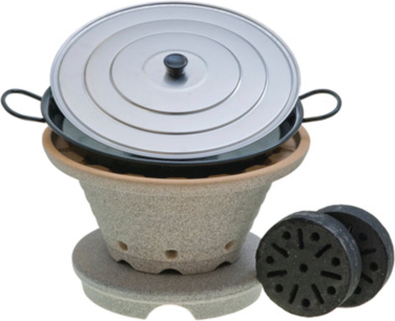 Contenuto della confezione: barbecue da tavolo, base, ciotola CeraFlam® con rivestimento Granicium®, padella in acciaio smaltato, coperchio in alluminio, griglia portacenere in acciaio inox, 2 bricchette accendifuoco.