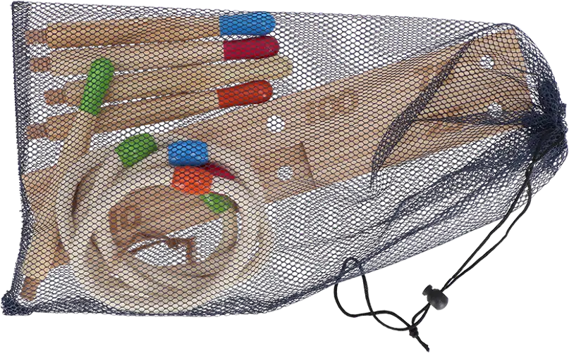 - Set con croce in legno, 5 anelli in corda e sacchetto a rete per riporlo