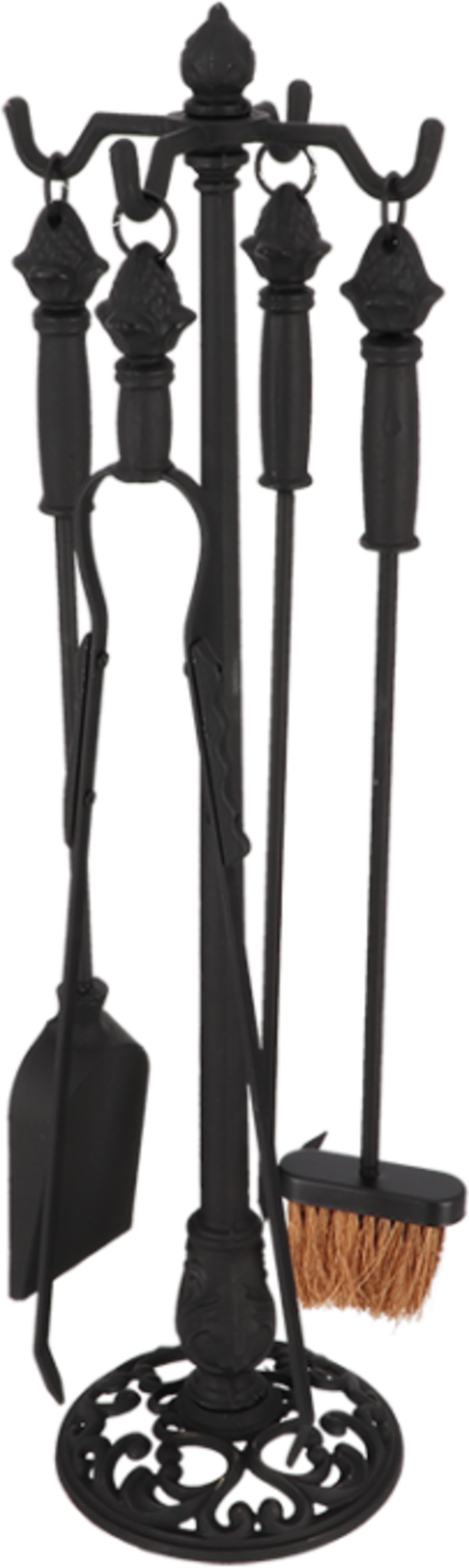 Perfetto per le serate accoglienti davanti al camino: questo set di accessori comprende quattro strumenti indispensabili e un elegante supporto con decorazioni a volute. Ideale per la cura e la pulizia della stufa o del caminetto.
