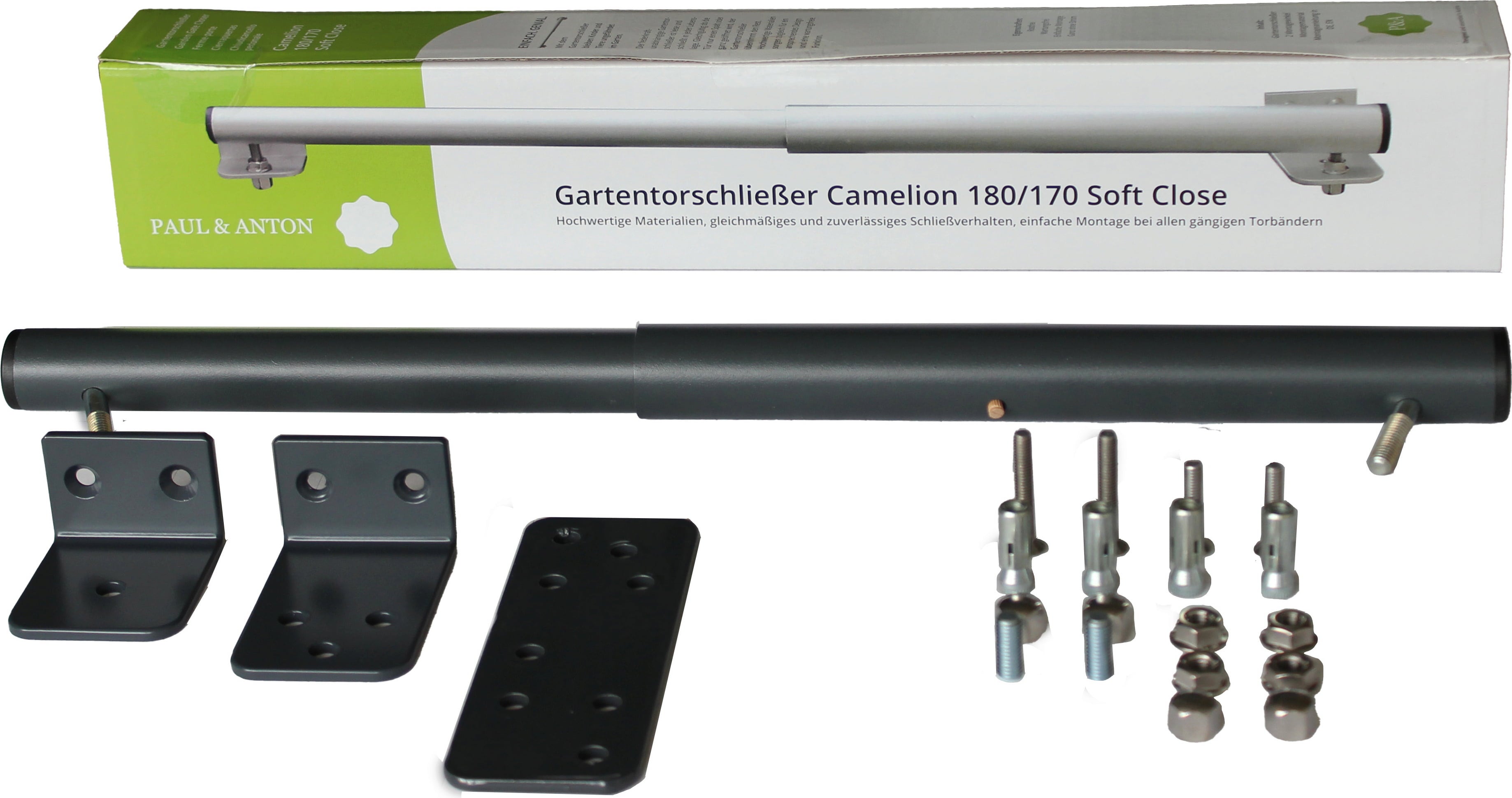 Gartentorschliesser Chiudicancello da Giardino Camelion 180/170 Soft Close, Angolo 80° + Piastra, Antracite Opaco