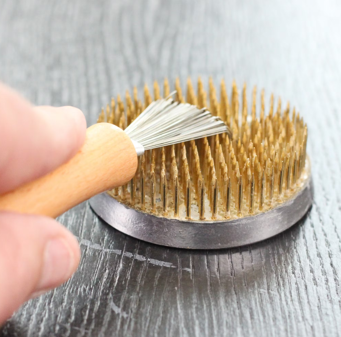 Dopo l'utilizzo del kenzan, utilizza semplicemente la spazzola fakir sotto acqua corrente e passala delicatamente tra gli aghi. In questo modo residui di fiori e impurità vengono rimossi in modo efficace. Successivamente risciacqua brevemente e lascia asciugare. Per un risultato ancora più brillante, la base in metallo può essere ulteriormente lucidata con la spazzola.