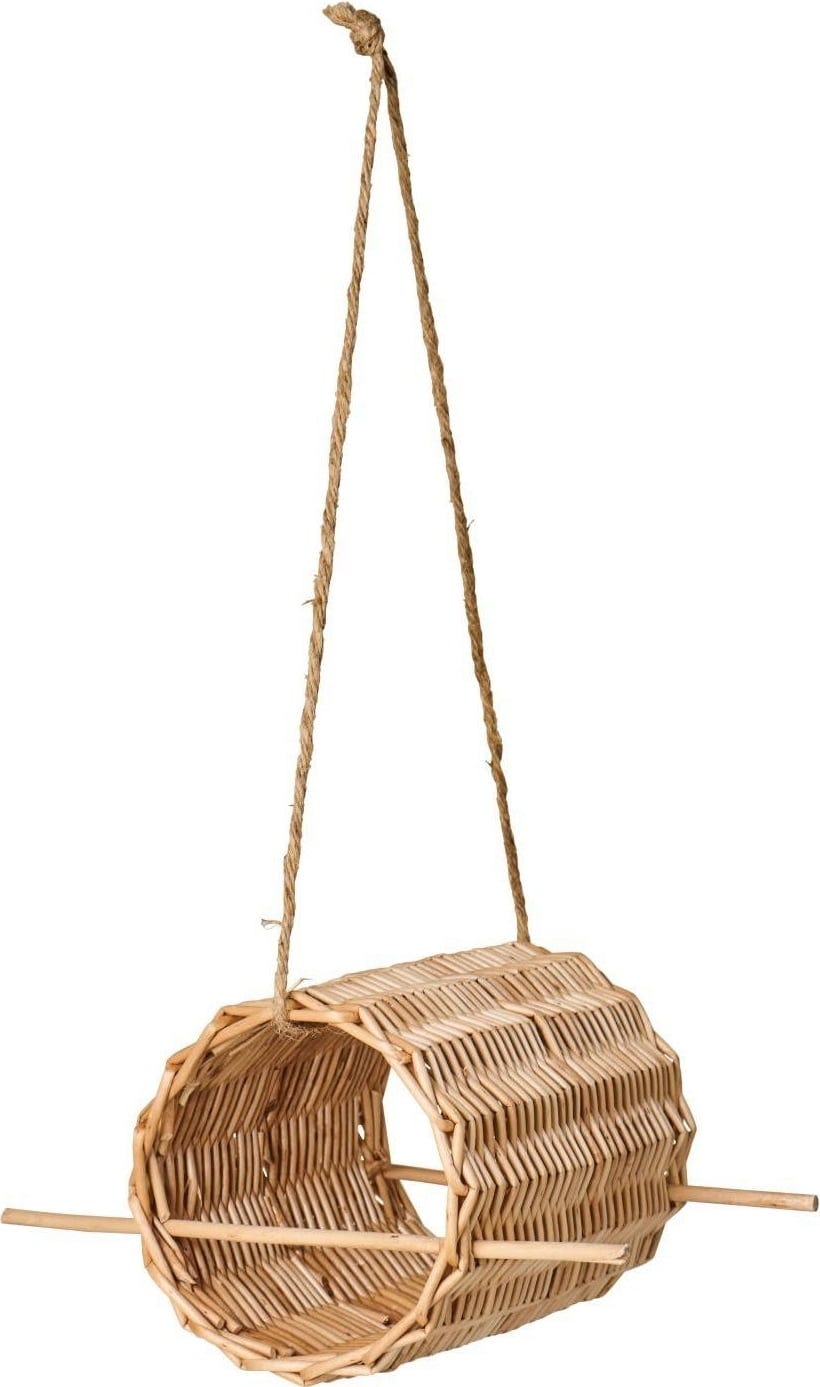 Mangiatoia per uccelli in vimini naturale, perfetta per offrire ai volatili un luogo protetto dove nutrirsi e aggiungere al giardino un elemento decorativo dal fascino autentico.