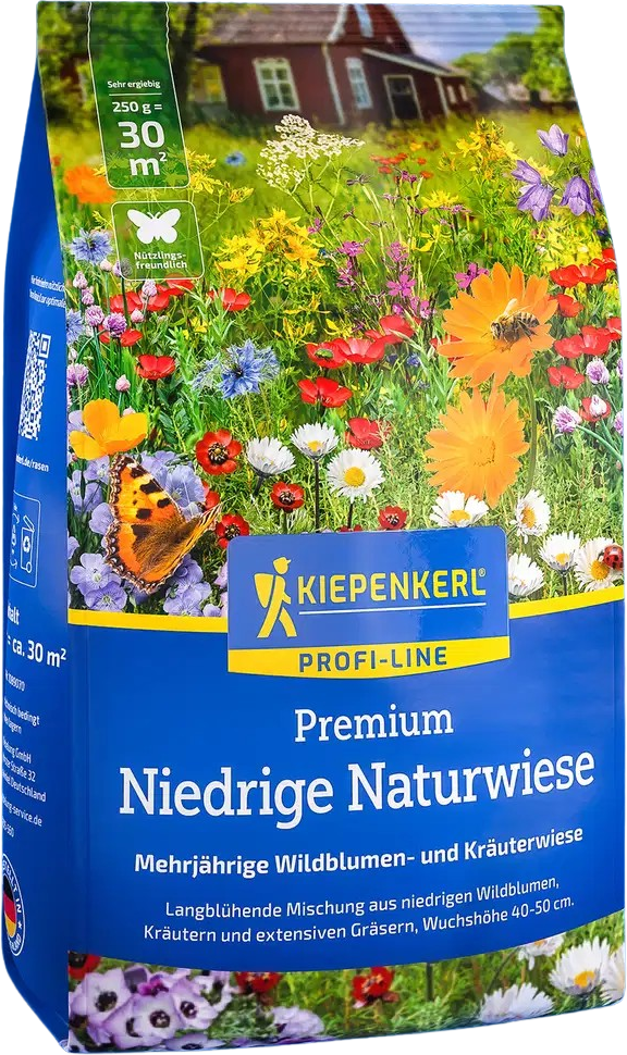 Il prato naturale basso della Profi-Line Premium è ideale per piccoli spazi del giardino in cui si desiderano fioriture colorate senza ostacolare la visuale. Il miscuglio di fiori spontanei e piante aromatiche a crescita contenuta attira api e farfalle, crea un habitat prezioso e garantisce una superficie fiorita sostenibile e facile da gestire. Perfetto per chi sogna un prato fiorito compatto e naturale.