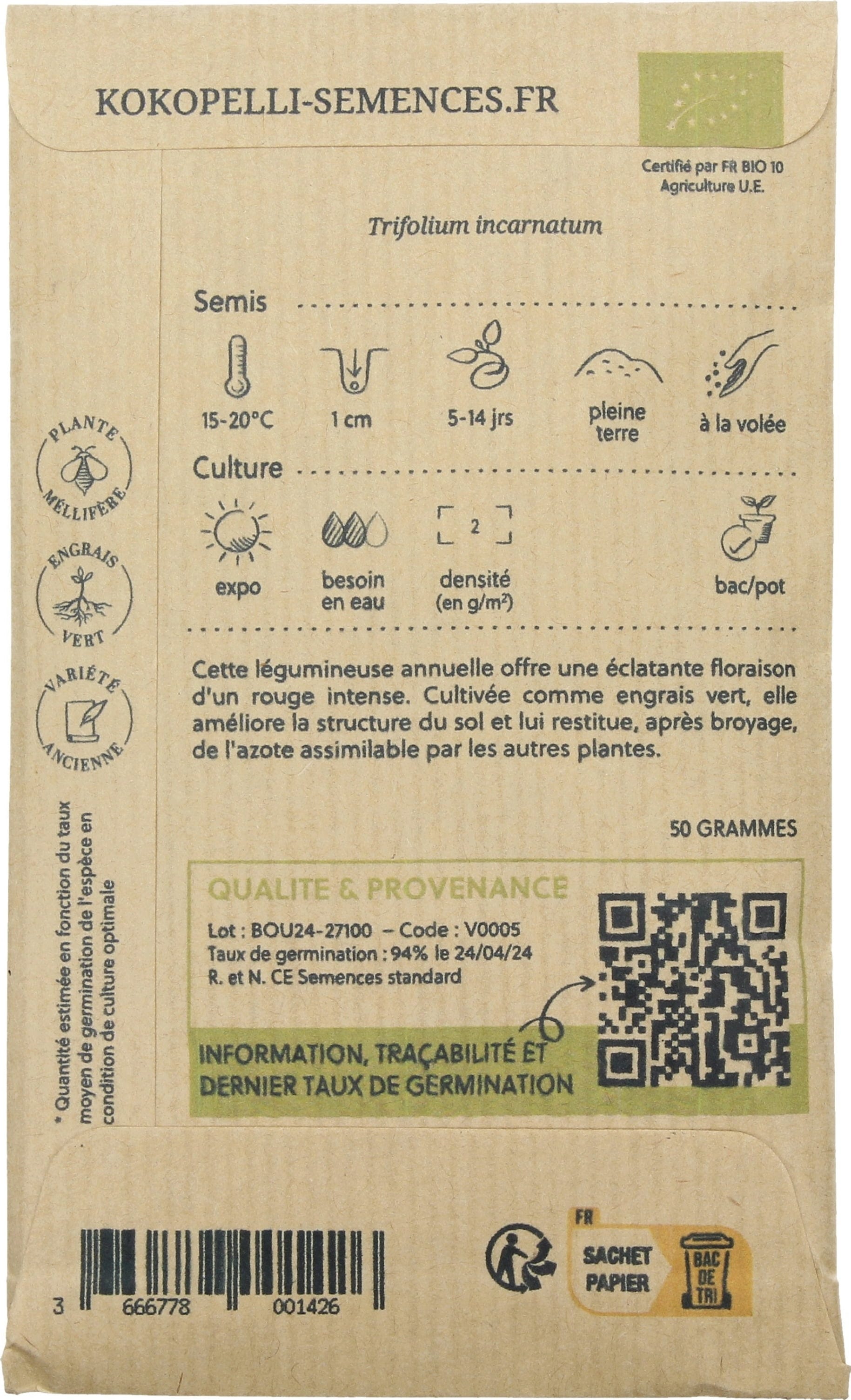 Il trifoglio incarnato colpisce per i suoi fiori color porpora, commestibili e molto apprezzati dalle api. La pianta migliora la struttura del terreno, arricchisce il suolo di azoto e, grazie al suo apparato radicale profondo, favorisce l'attività dei lombrichi. Ideale come sovescio, pianta foraggera o per giardini naturali, il trifoglio protegge il terreno in inverno, limita la crescita delle infestanti e offre abbondante nutrimento agli impollinatori.
