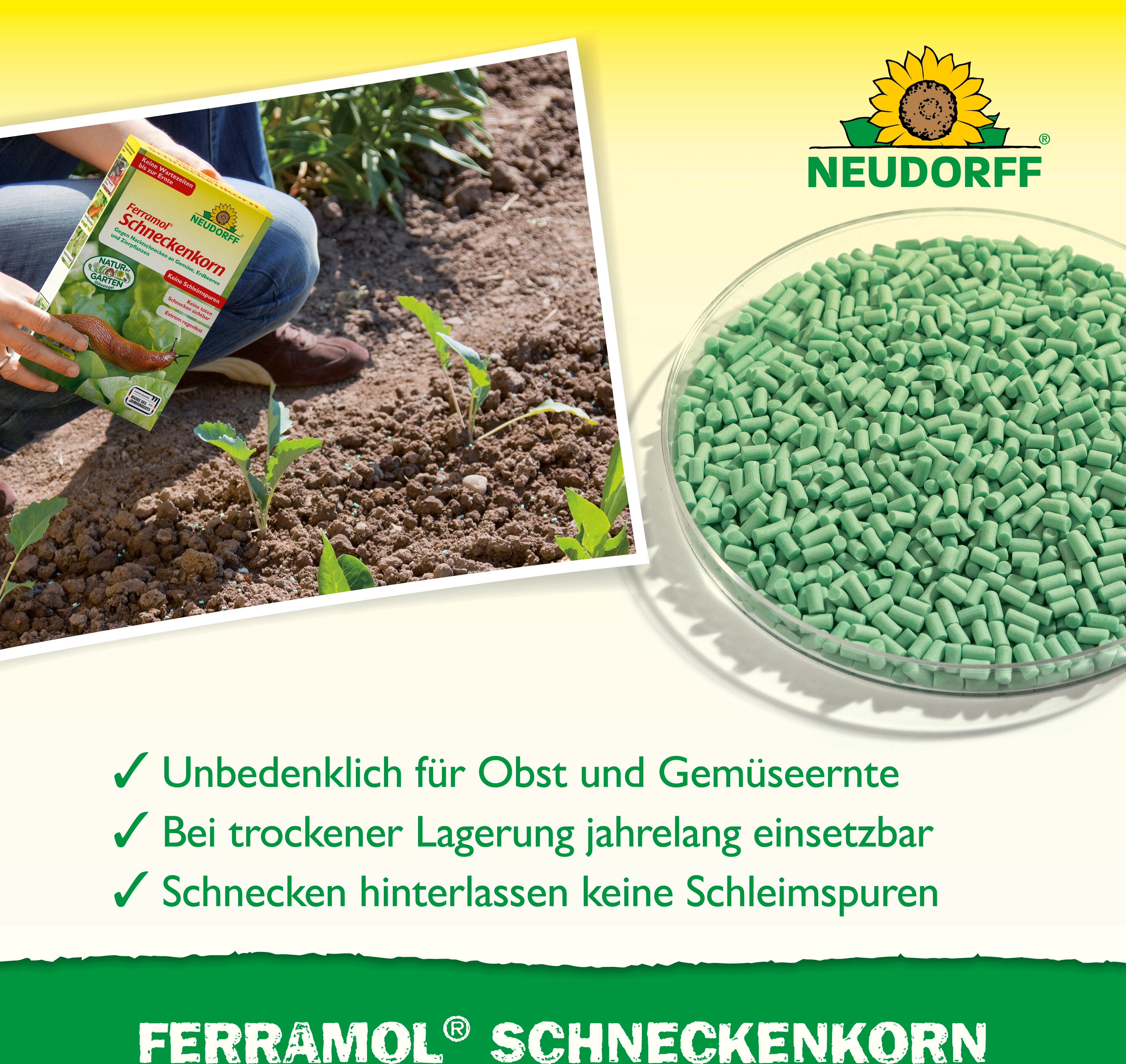 Ferramol® è indicato per il controllo delle lumache senza guscio su ortaggi, piante ornamentali e colture frutticole. Allo stesso tempo rispetta gli animali domestici, le api (in Germania: NB 6641), i ricci e altri organismi utili. Grazie a un'innovativa tecnologia di esca è estremamente resistente alla pioggia. Il principio attivo fosfato ferrico (fosfato di ferro III) è una sostanza presente anche in natura. Il suo particolare meccanismo d'azione fa sì che non rimangano lumache morte visibili e che non si verifichi la tipica secrezione di muco.
