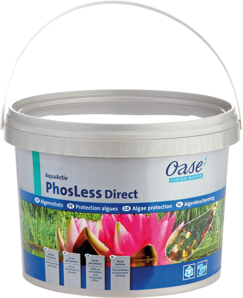 I fosfati in eccesso accelerano la crescita delle alghe. Con PhosLess Direct, Oase offre una protezione dalle alghe con effetto immediato, legando i fosfati. L'agente lega anche l'idrogeno solforato, la causa dei cattivi odori. Il prodotto può essere utilizzato tutto l'anno in laghetti con pesci.
