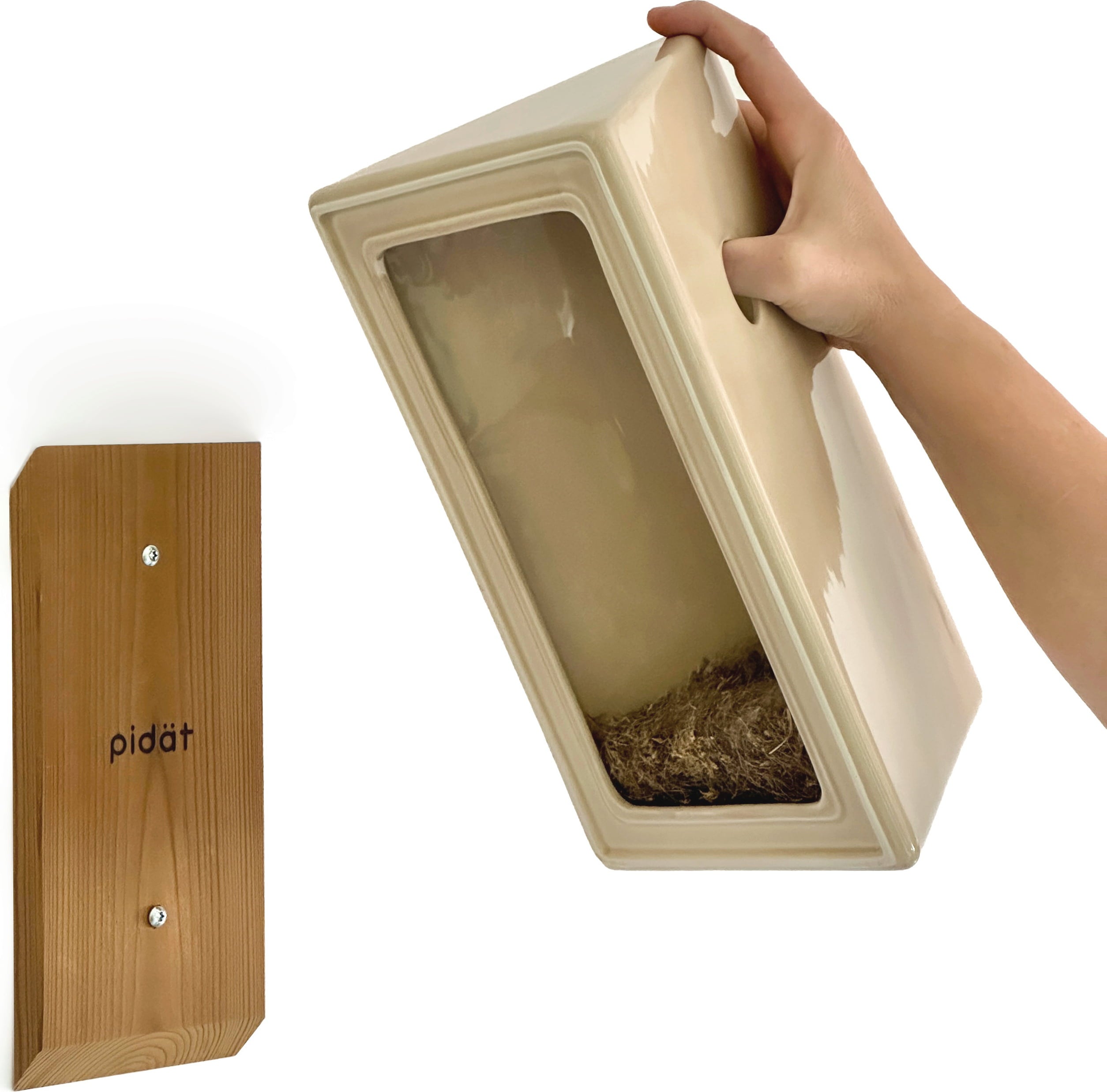 La casetta è realizzata artigianalmente in Portogallo con legno di pino trattato termicamente e privo di sostanze nocive, abbinato a ceramica smaltata. All’interno, sotto il foro di uscita, la superficie è leggermente ruvida per agevolare i piccoli uccelli quando devono arrampicarsi verso l’esterno.