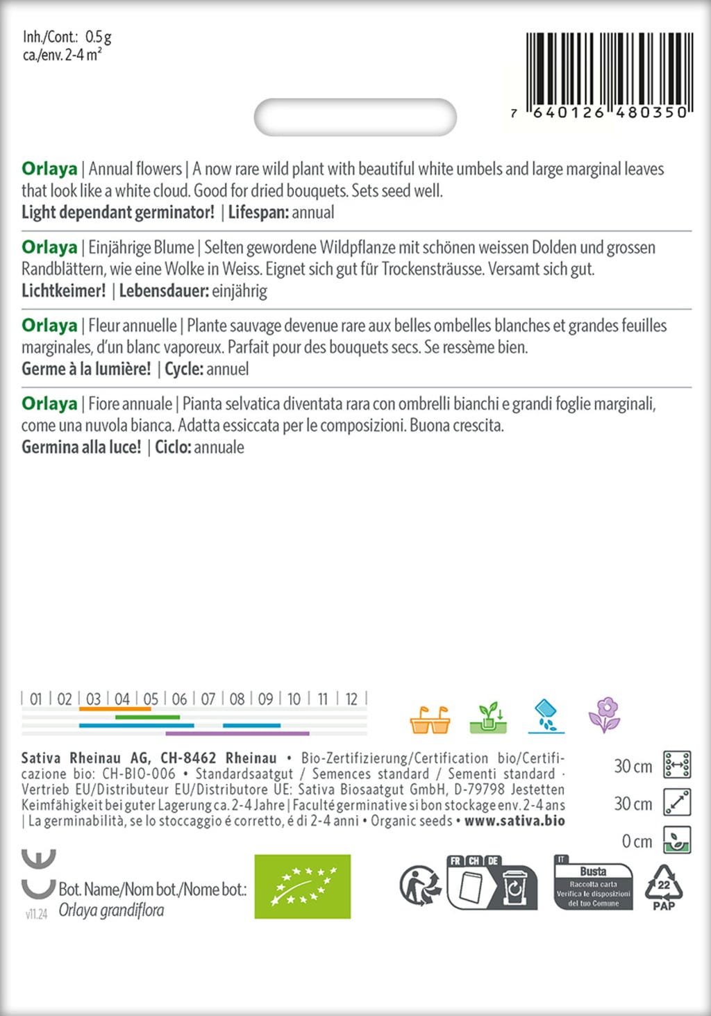 L'Orlaya grandiflora è una rara pianta spontanea dai raffinati ombrelli di fiori bianchi, con petali esterni decorativi che ricordano una nuvola leggera. È ideale per mazzi secchi e si risemina spontaneamente in giardino.