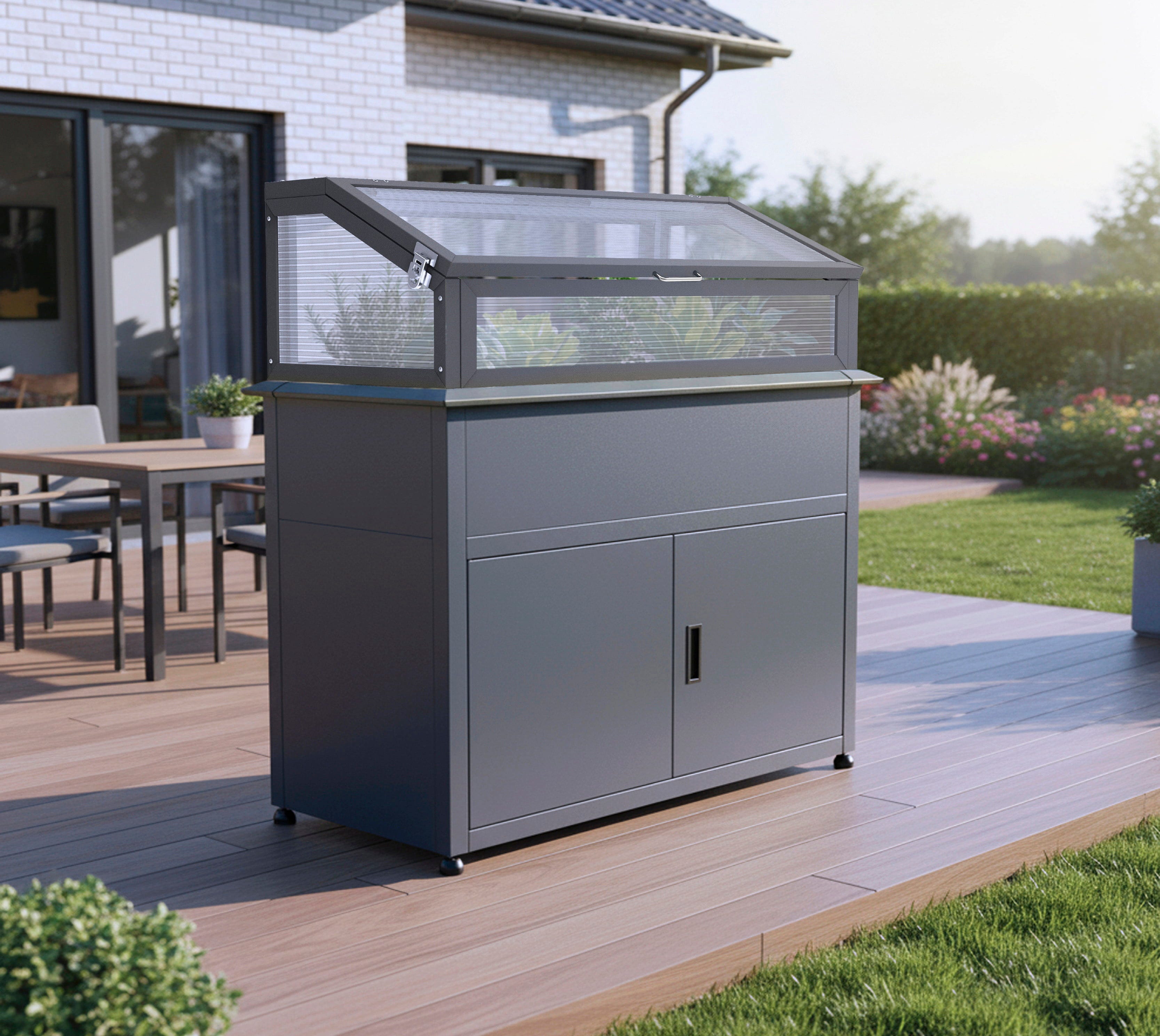 Orto Rialzato - Plexa si distingue per il robusto corpo in acciaio con ampia superficie di coltivazione, pratico vano contenitivo e coperchio da semenzaio incluso. Inoltre, è dotato di un bordo anti-lumaca e di un sistema di drenaggio ben studiato che previene i ristagni idrici. In questo modo unisce design moderno e massima funzionalità, offrendo la base ideale per prolungare la stagione di coltivazione e garantire alle giovani piante condizioni ottimali di crescita già nelle prime fasi.