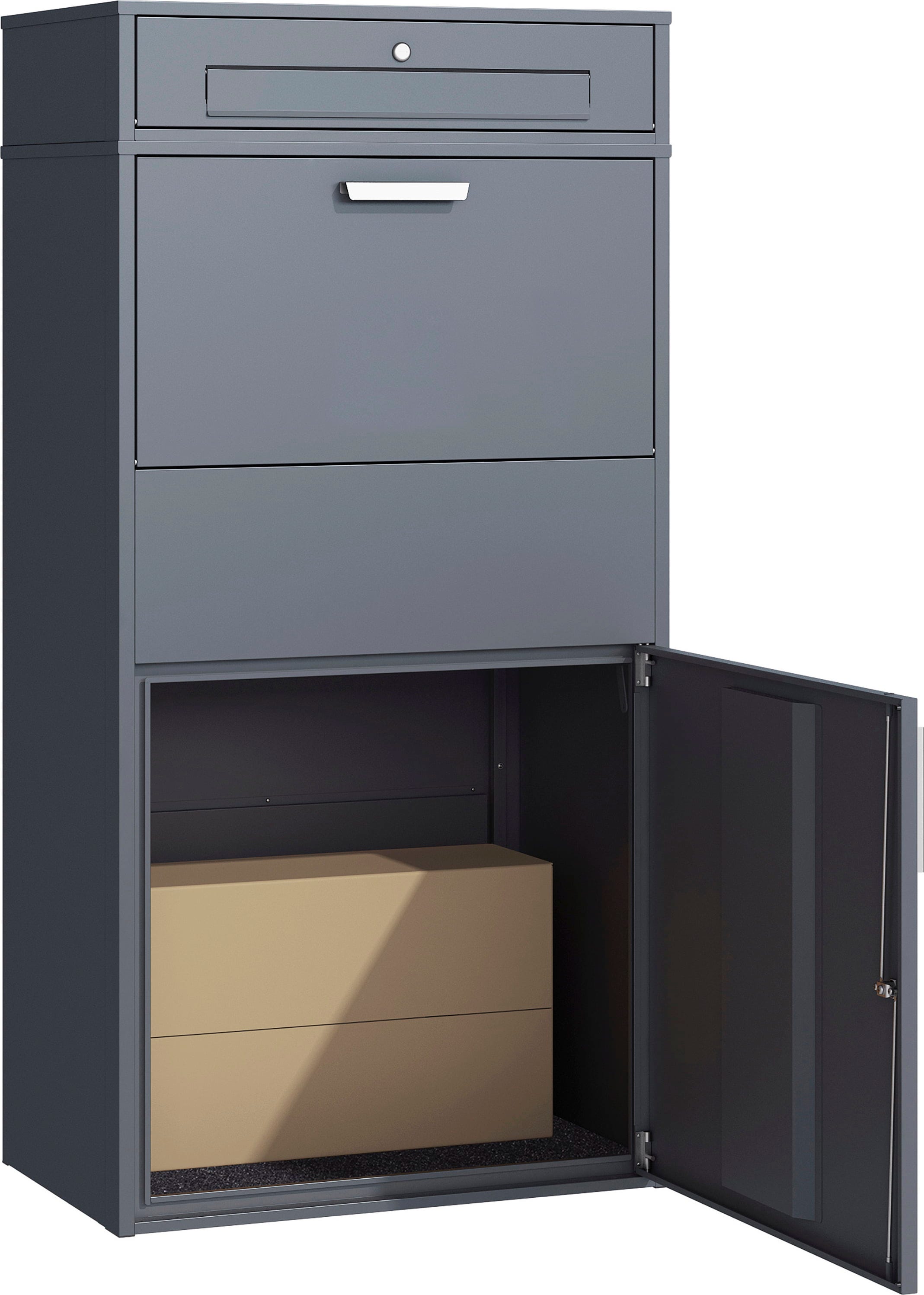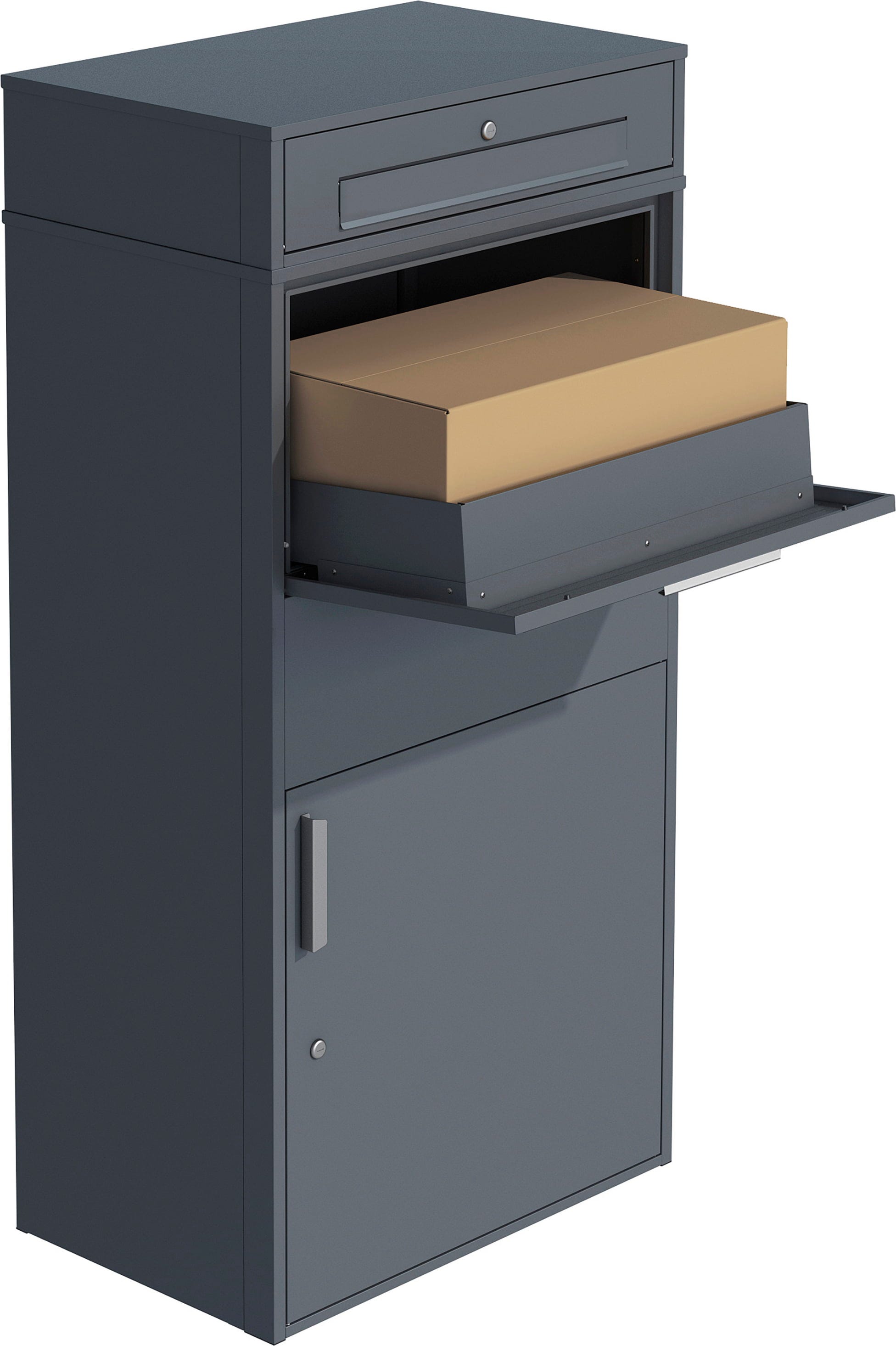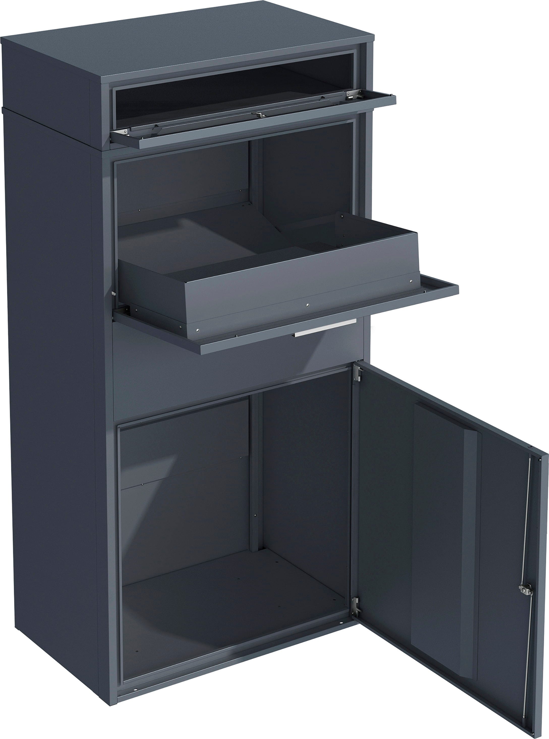 Cassetta per Pacchi - Pavo è un sistema ben studiato con tre scomparti: feritoia per lettere, vano di inserimento e vano principale. Si distingue per robustezza e resistenza agli agenti atmosferici ed è chiudibile in modo sicuro. Dopo aver inserito un pacco e aver richiuso il vano, la spedizione cade direttamente nel vano principale protetto. Inoltre, la cassetta per pacchi può essere ancorata al suolo tramite viti.