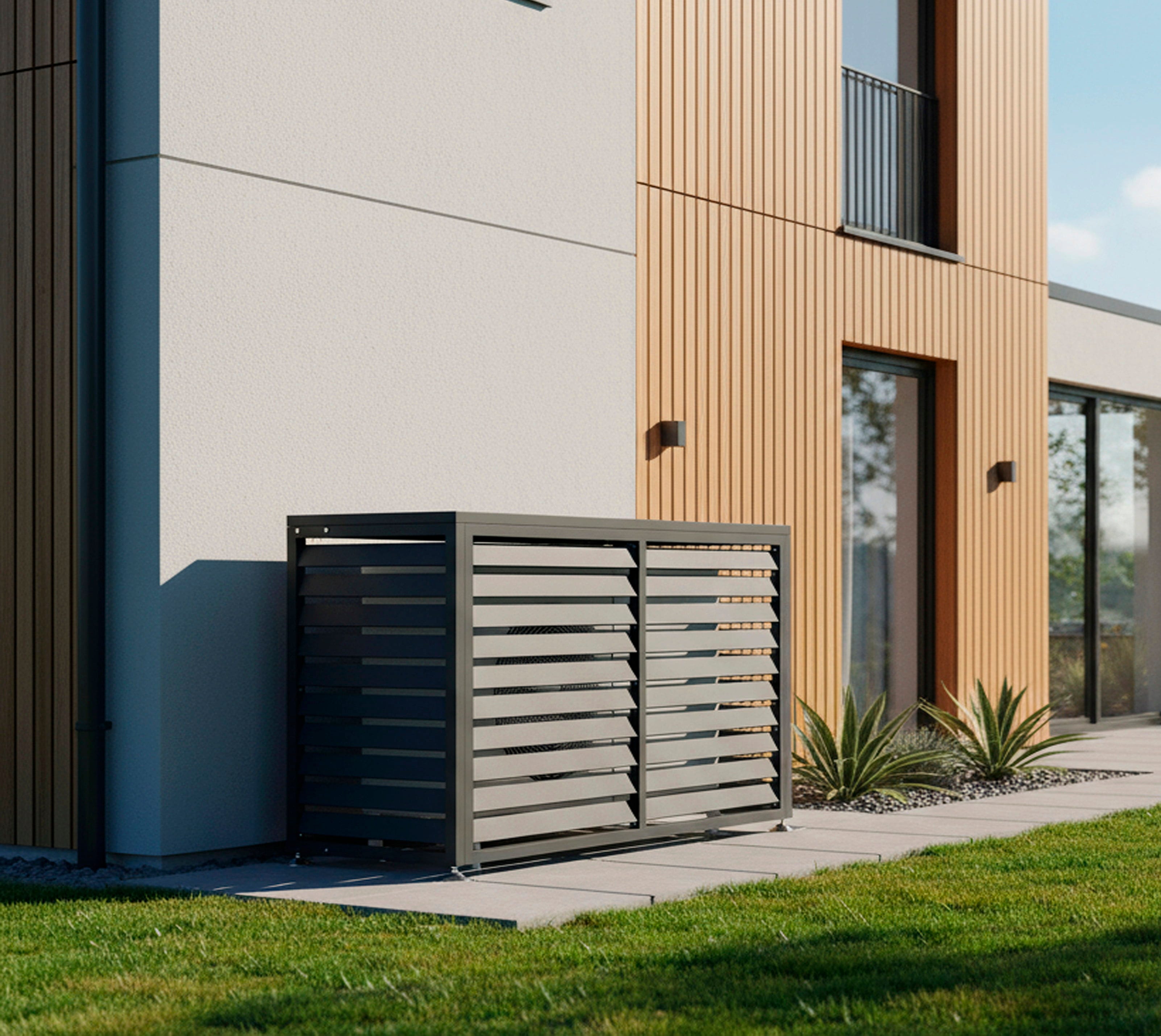La copertura per pompa di calore Boxa in acciaio zincato offre a pompe di calore e climatizzatori un rivestimento elegante e decorativo. In questo modo la tecnologia viene protetta in modo affidabile dagli agenti atmosferici e allo stesso tempo valorizzata dal punto di vista estetico.